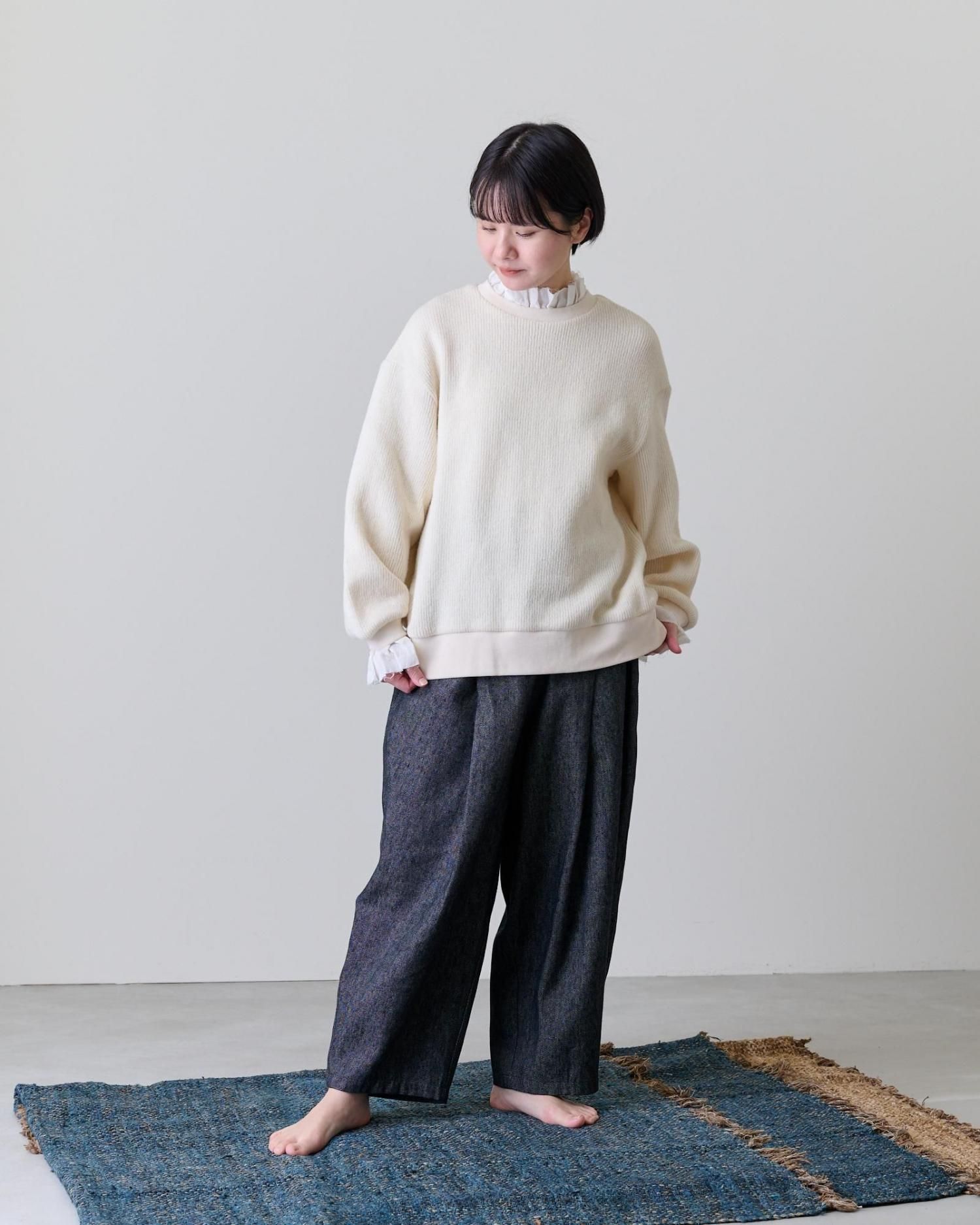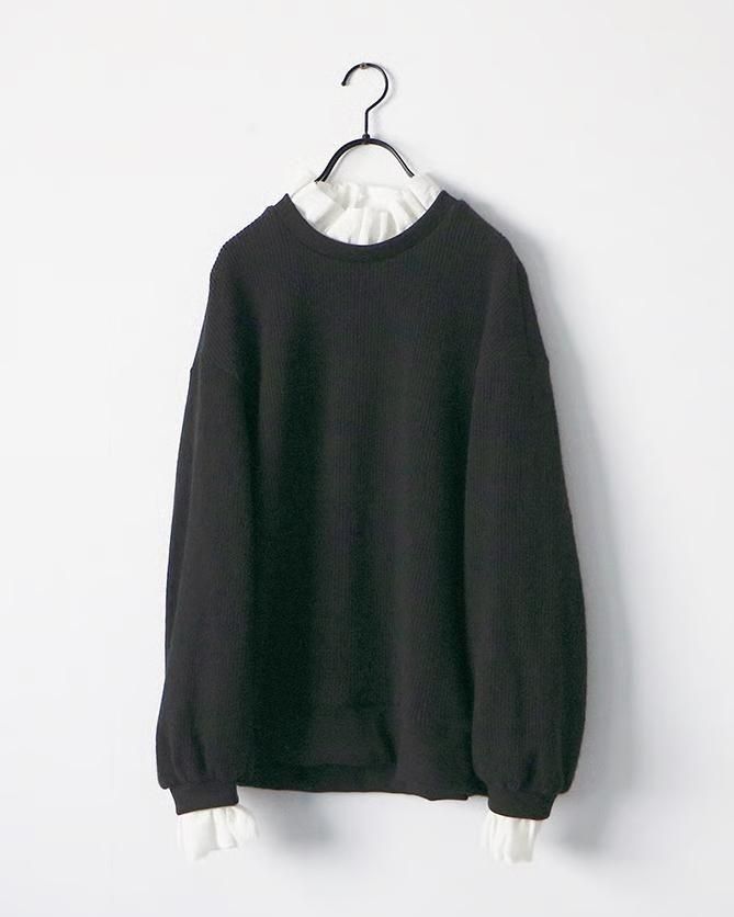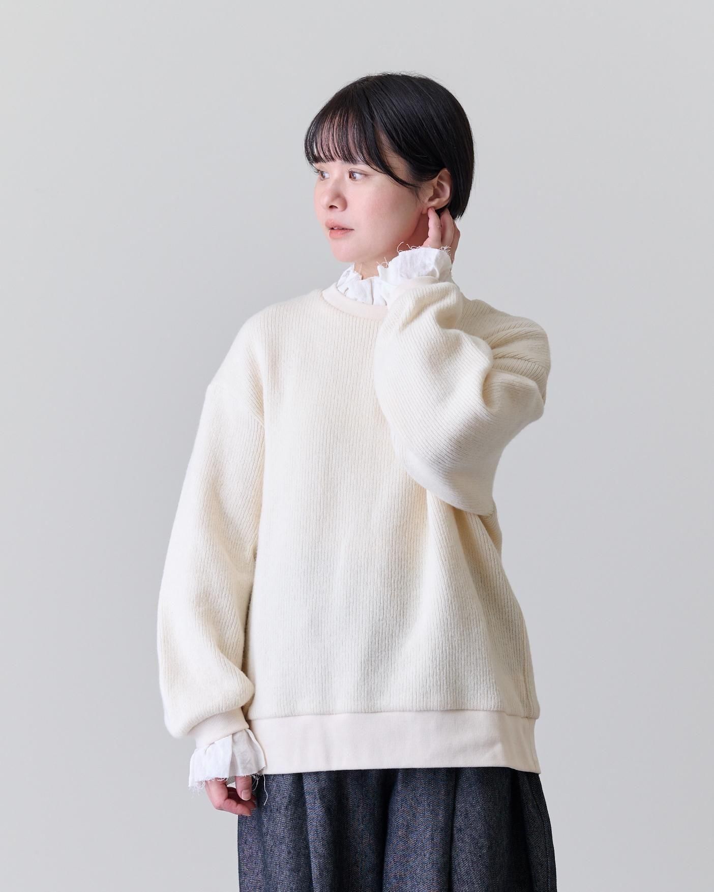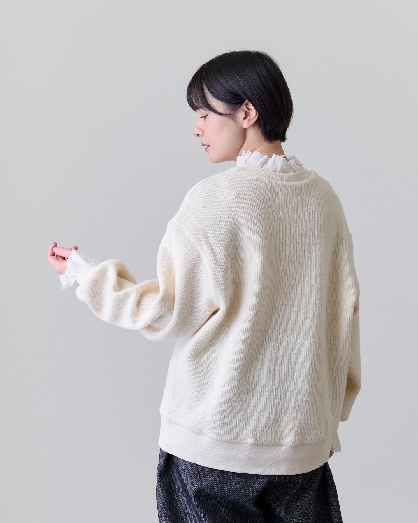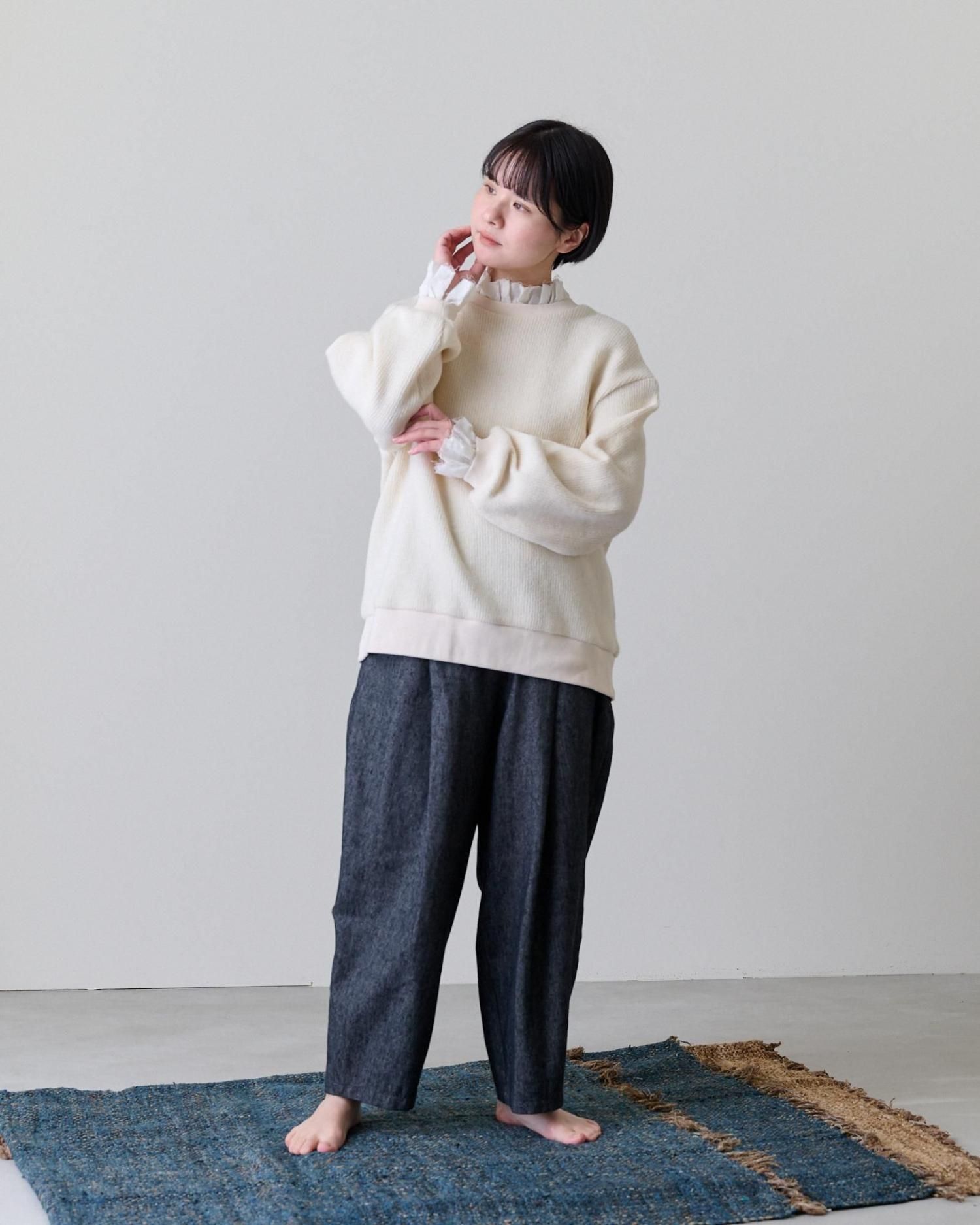 首元と袖口にリネン地のフリルを付けたニットプルオーバーです。