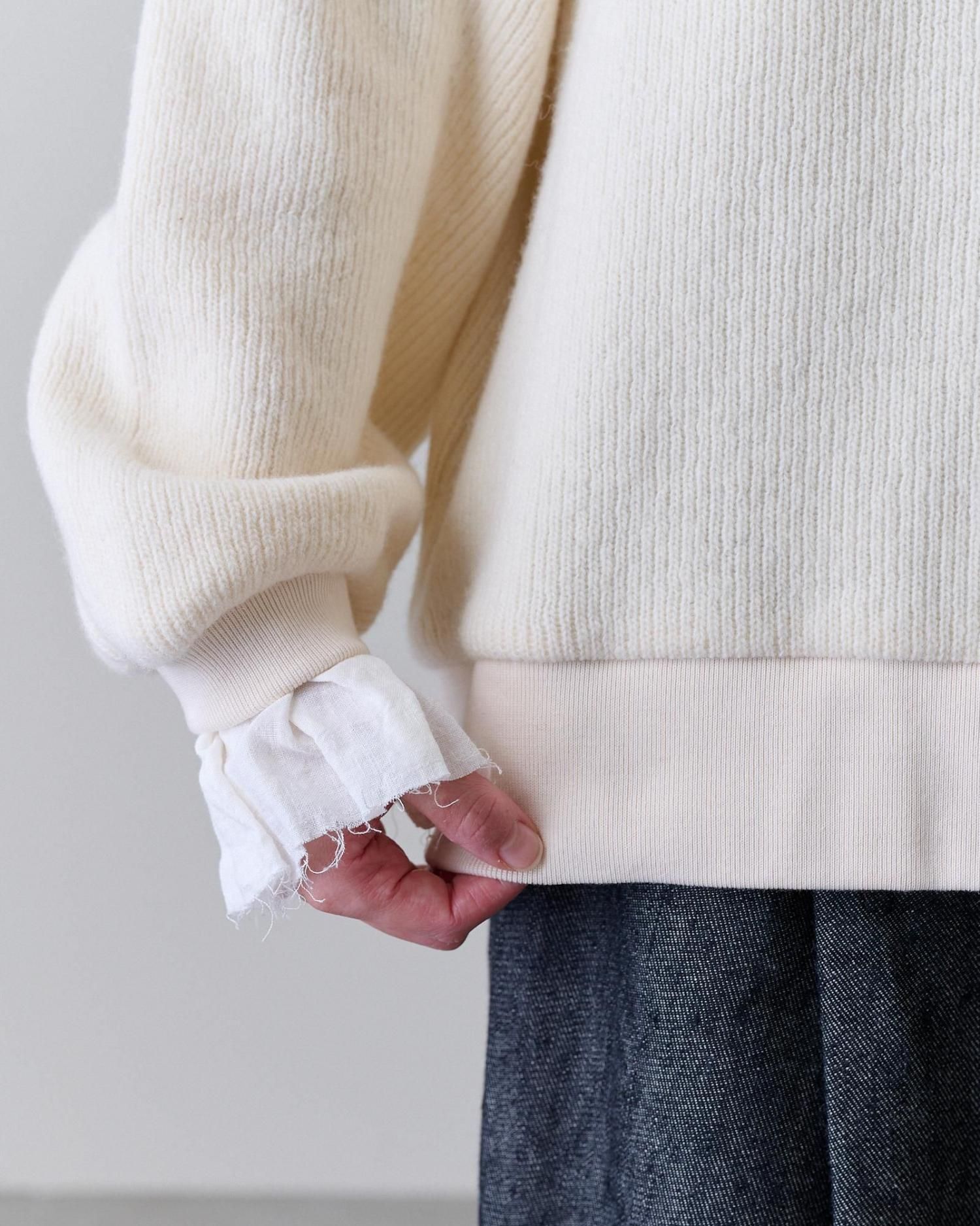 特殊な編み機によって編まれたクォーターニットは、 表にウール、裏にはコットンが出るように編まれているので、ニットのチクチク感がなく、アンダー無しでもカットソーのような快適な肌触りで着られます。