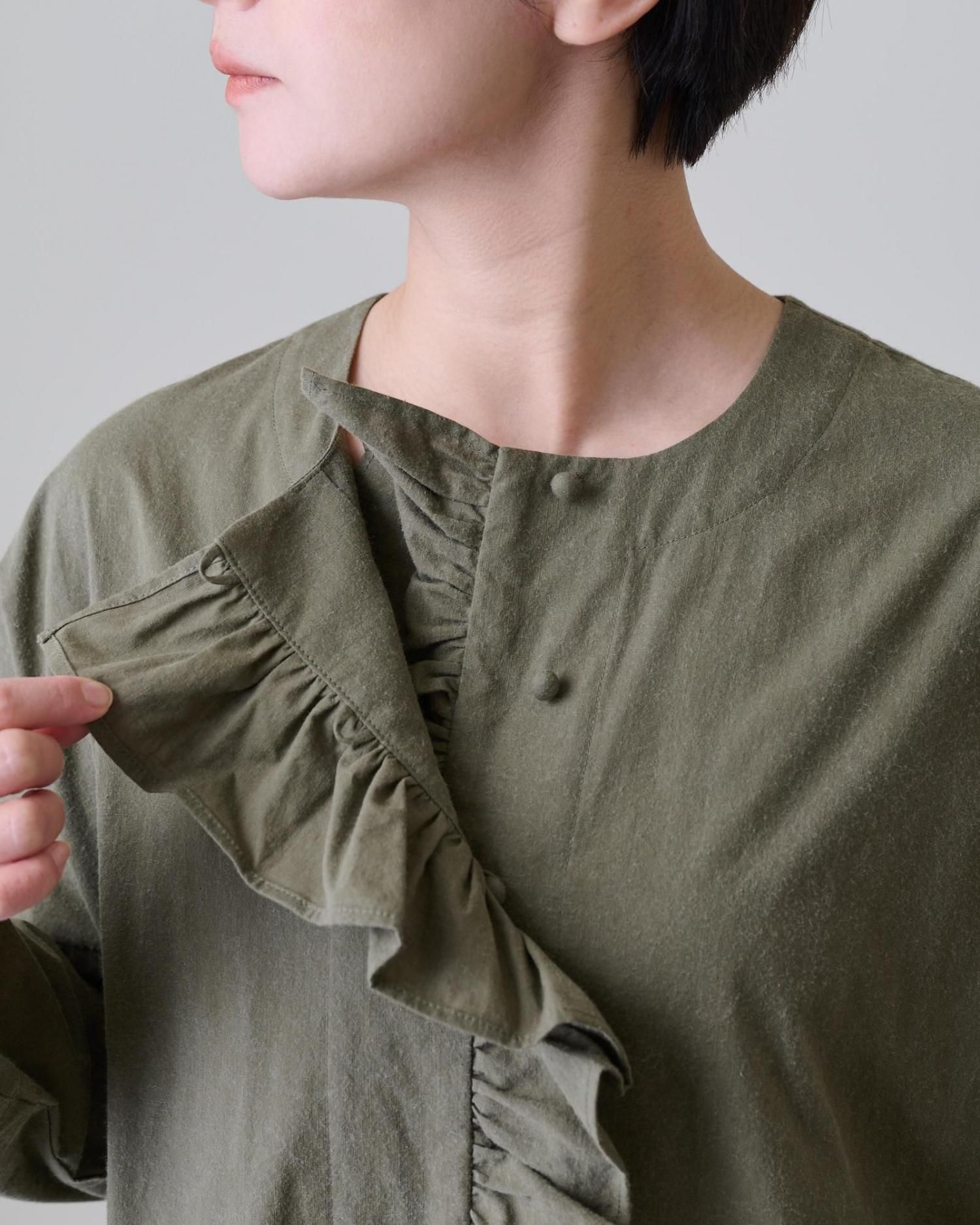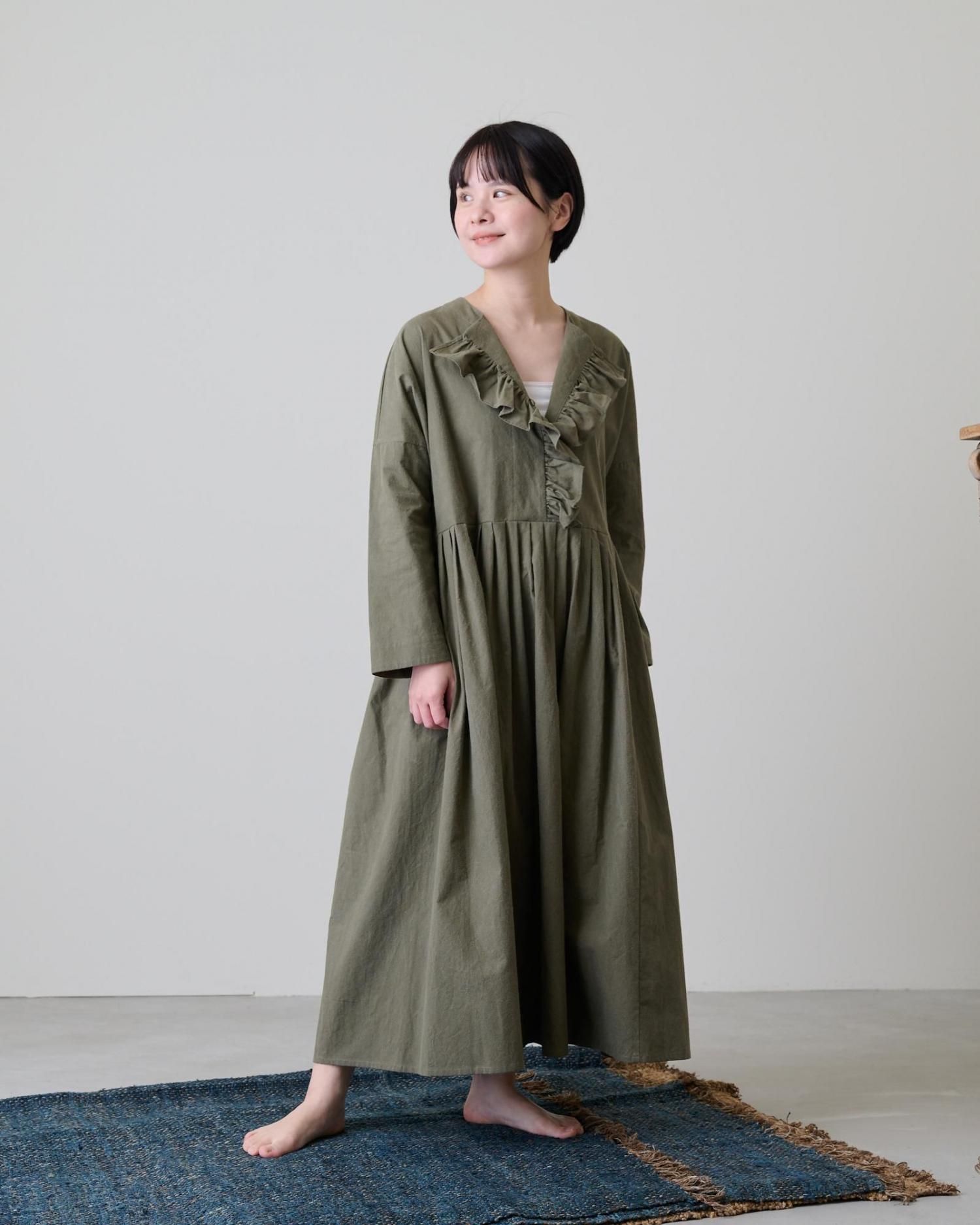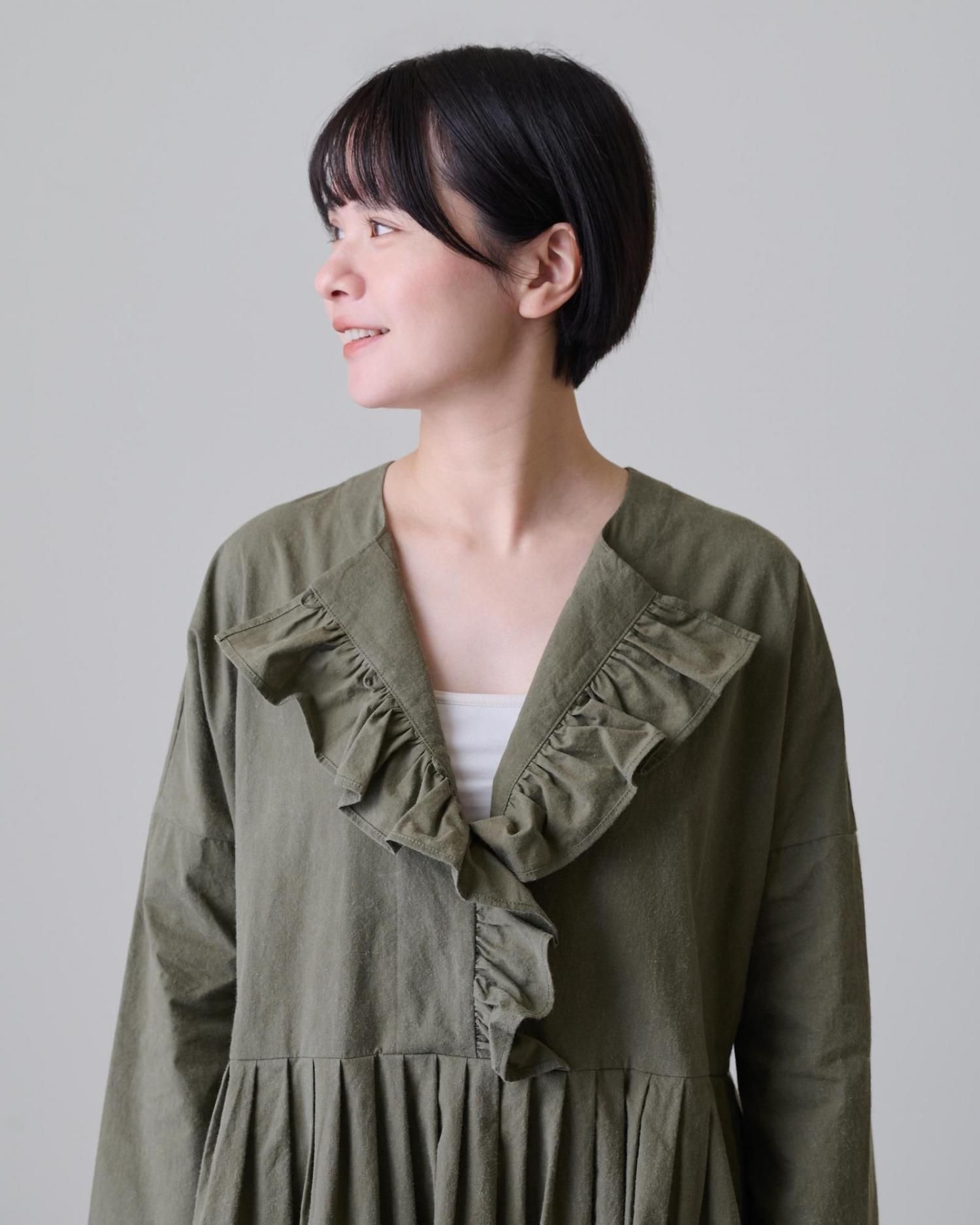 森の木々を思わせる深みのあるカーキの色が、フリルの甘さを抑え、上品な雰囲気を作り上げているバランスの取れた一着です。