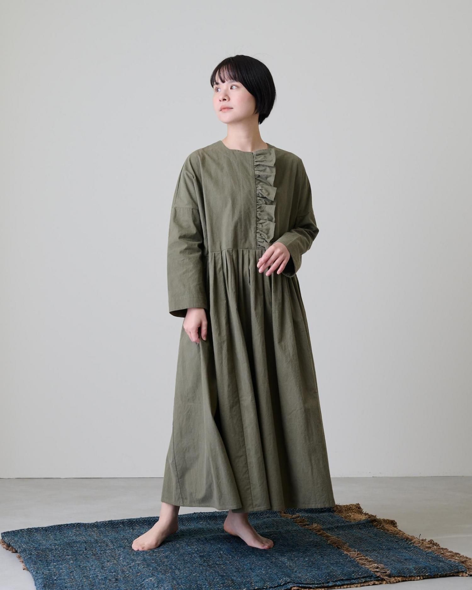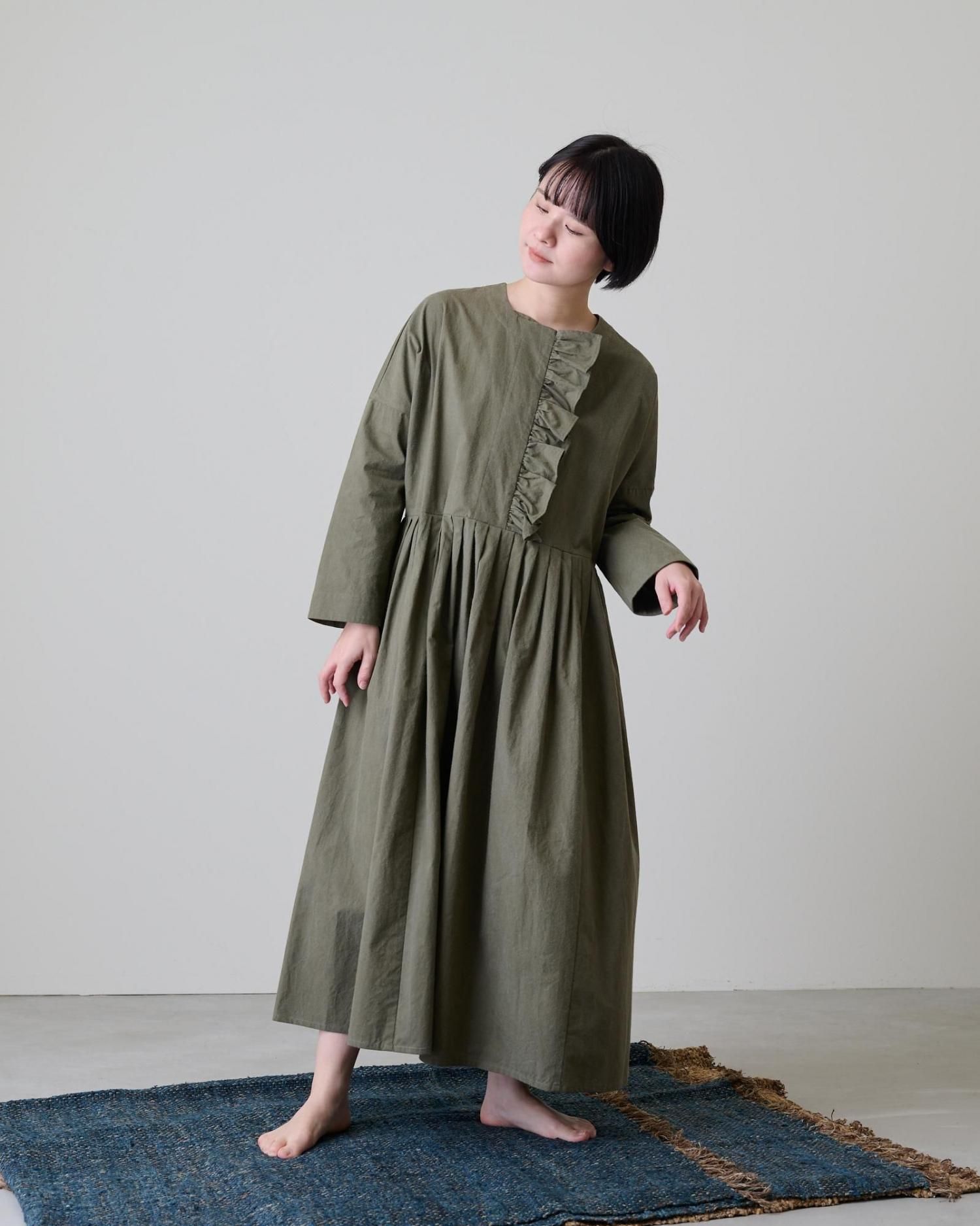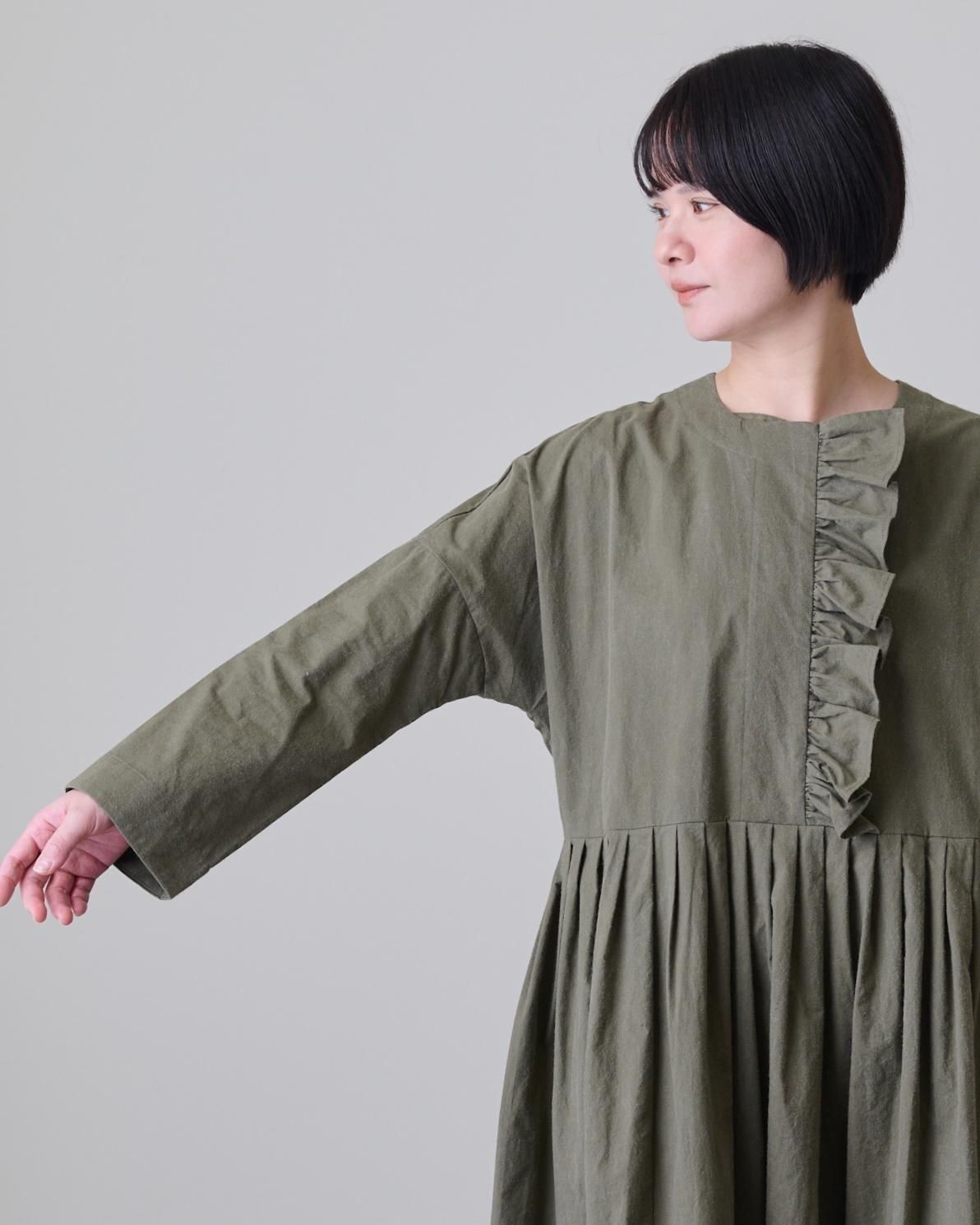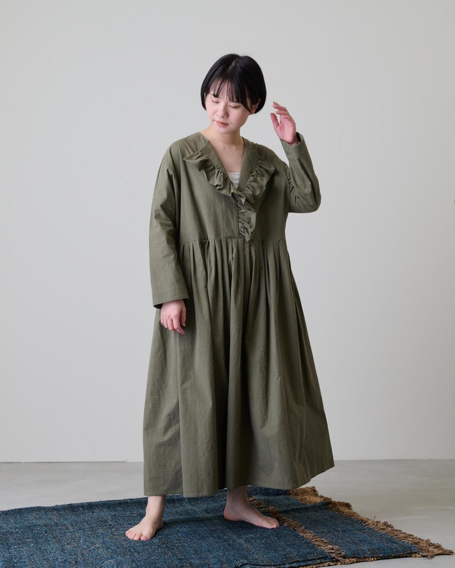 森の木々を思わせる深みのあるカーキの色が、フリルの甘さを抑え、上品な雰囲気を作り上げているバランスの取れた一着です。