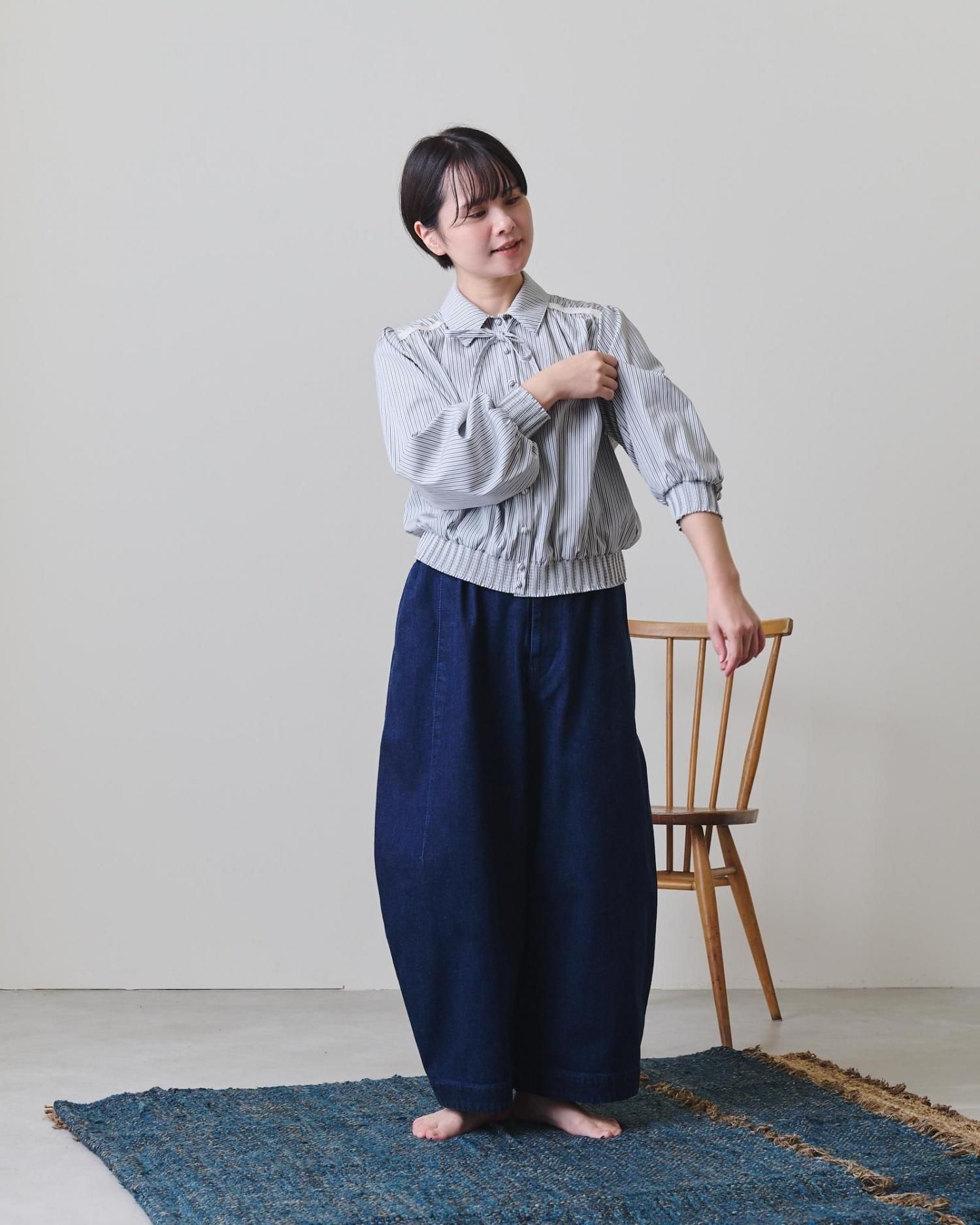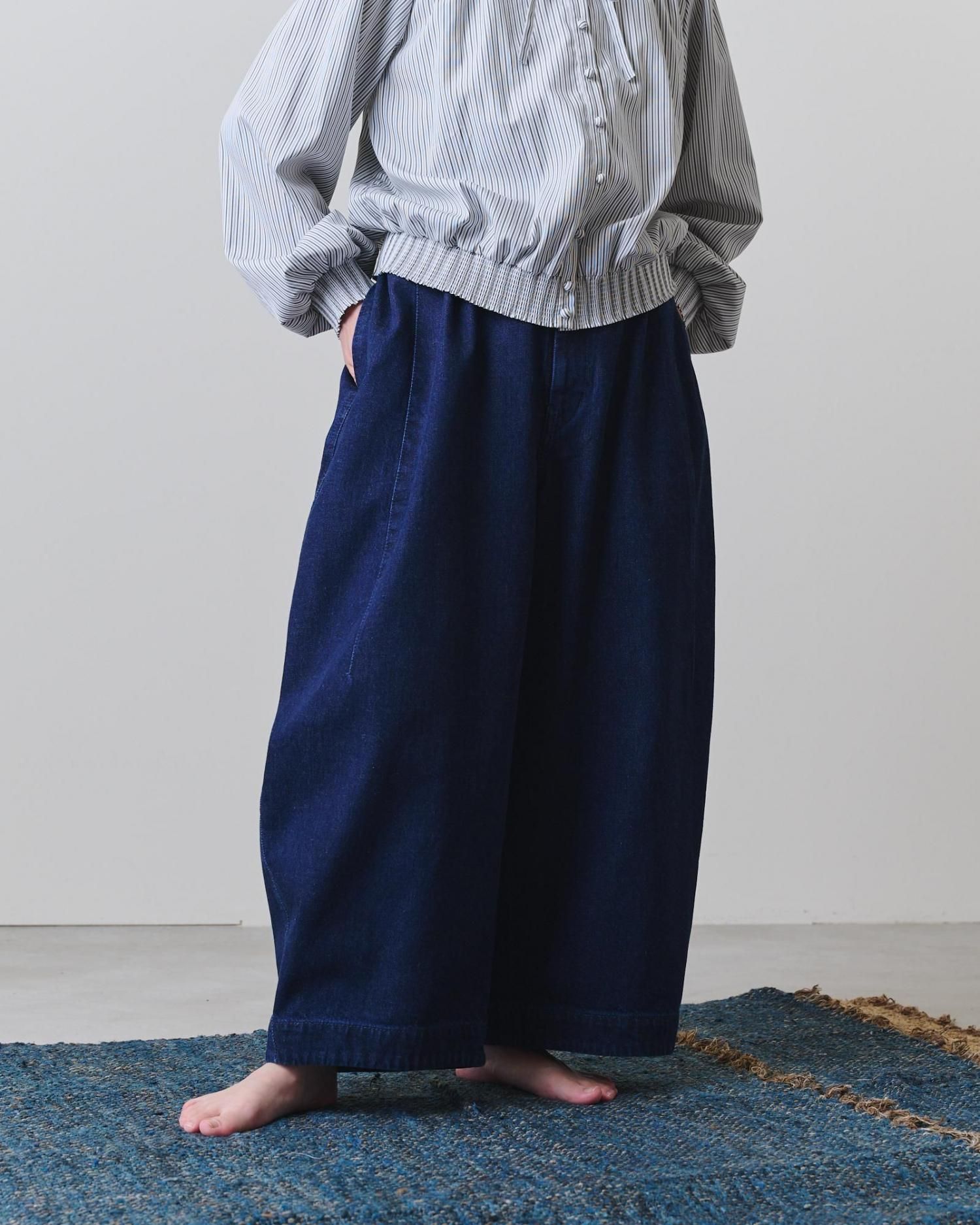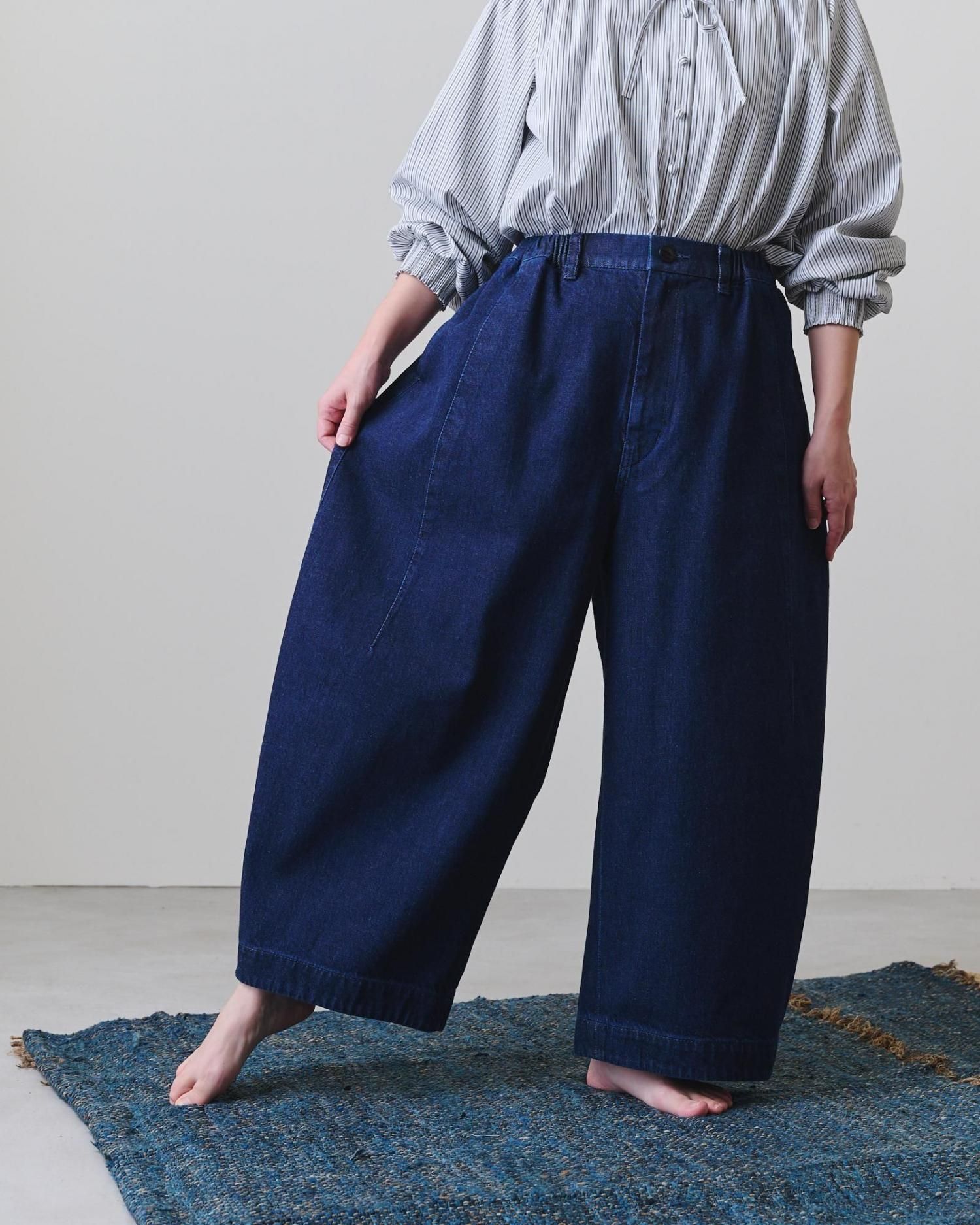 裾に向かい丸みを帯びつつすぼまることで、ボリュームがありながらも重く見えず、個性的なパンツに仕上がっています。