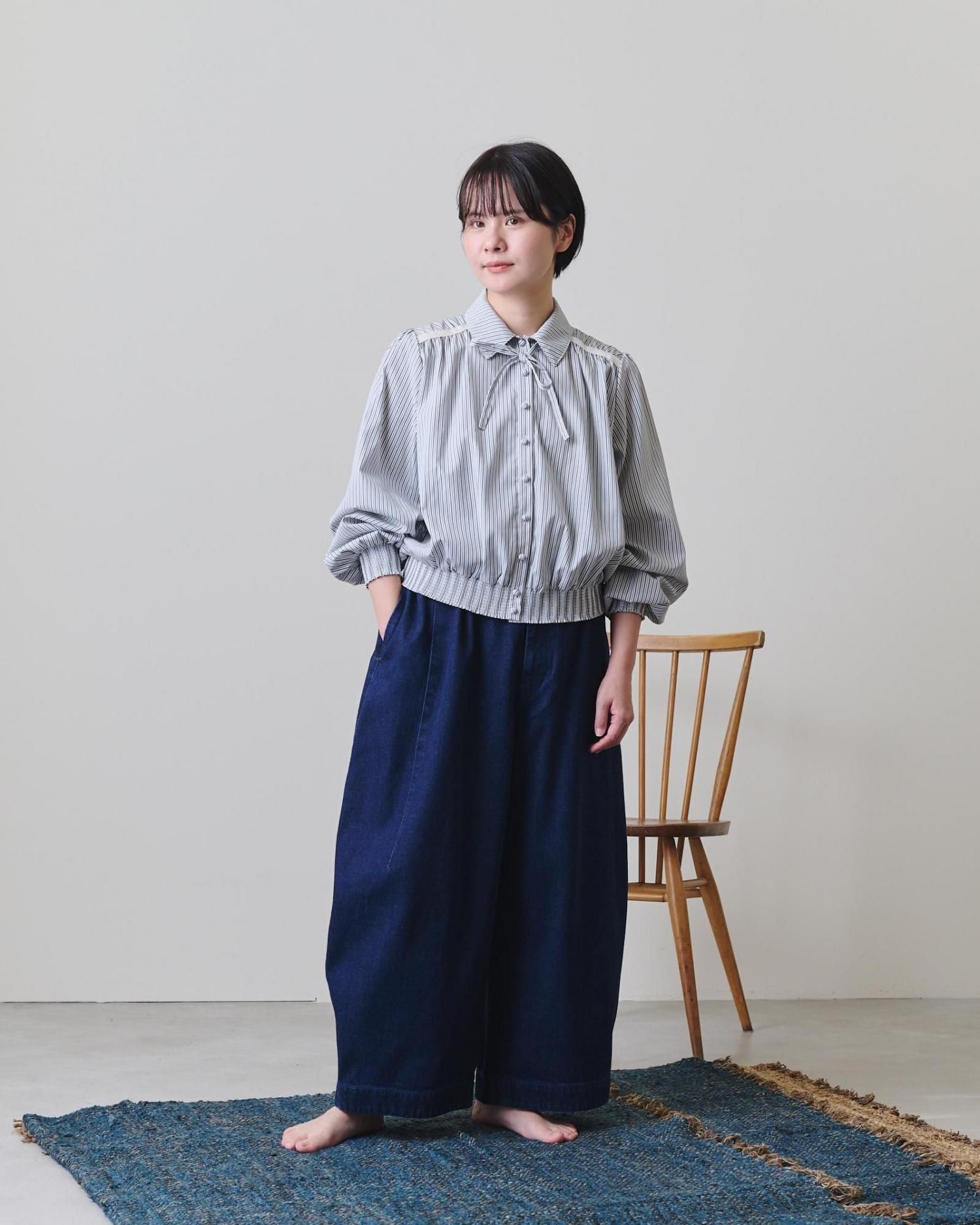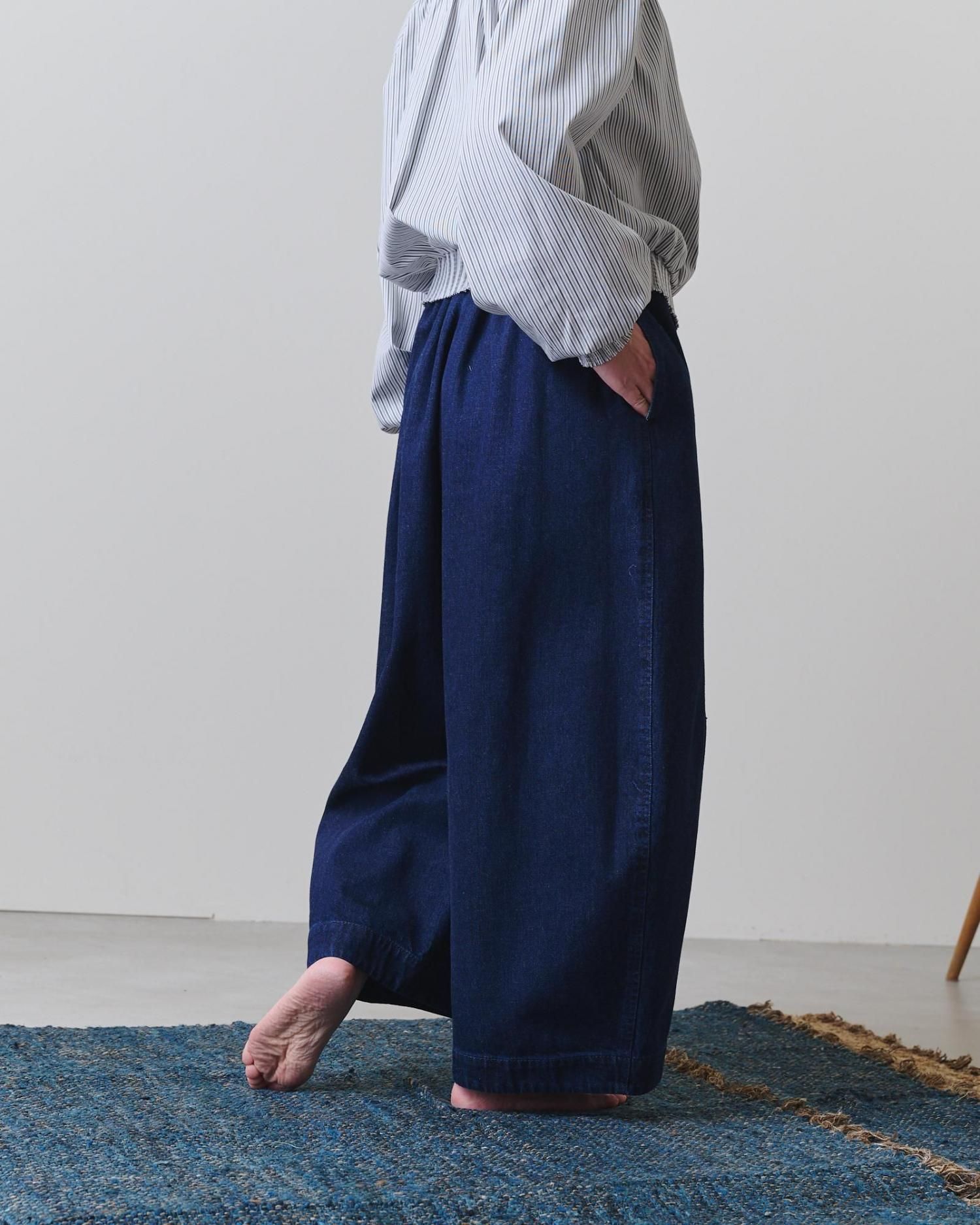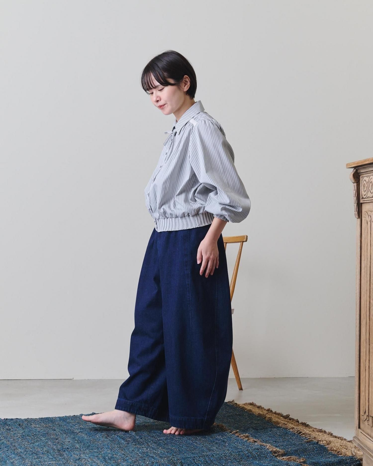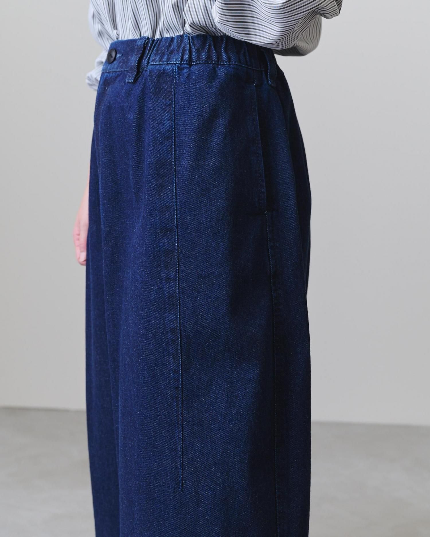 裾に向かい丸みを帯びつつすぼまることで、ボリュームがありながらも重く見えず、個性的なパンツに仕上がっています。