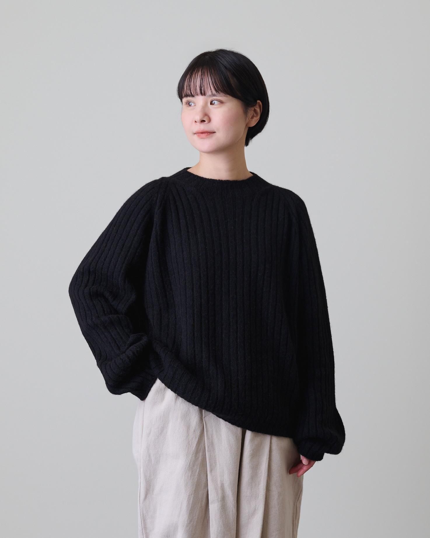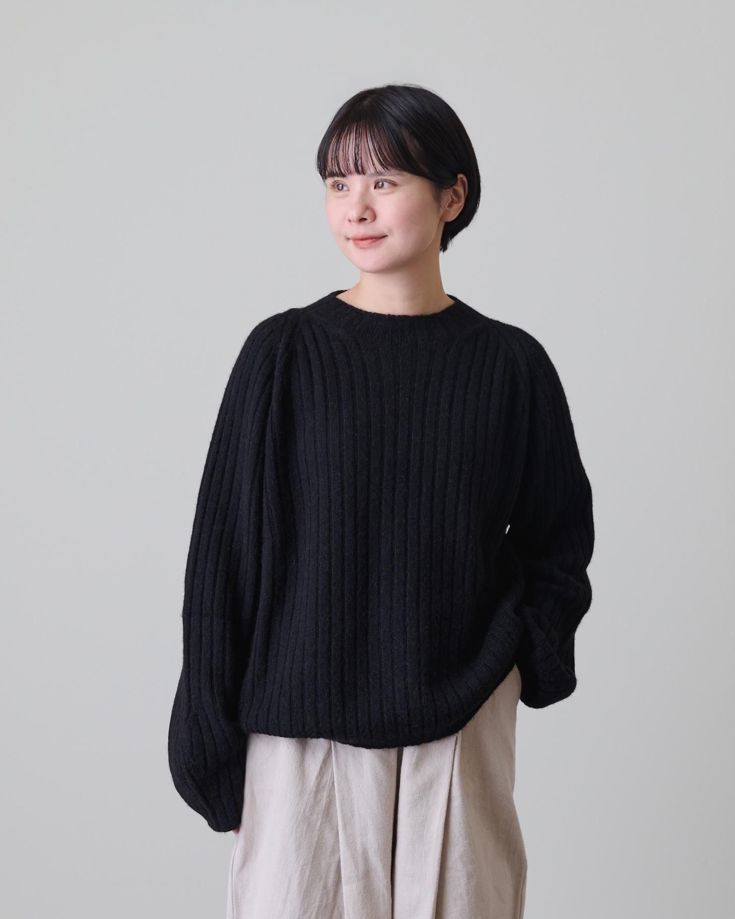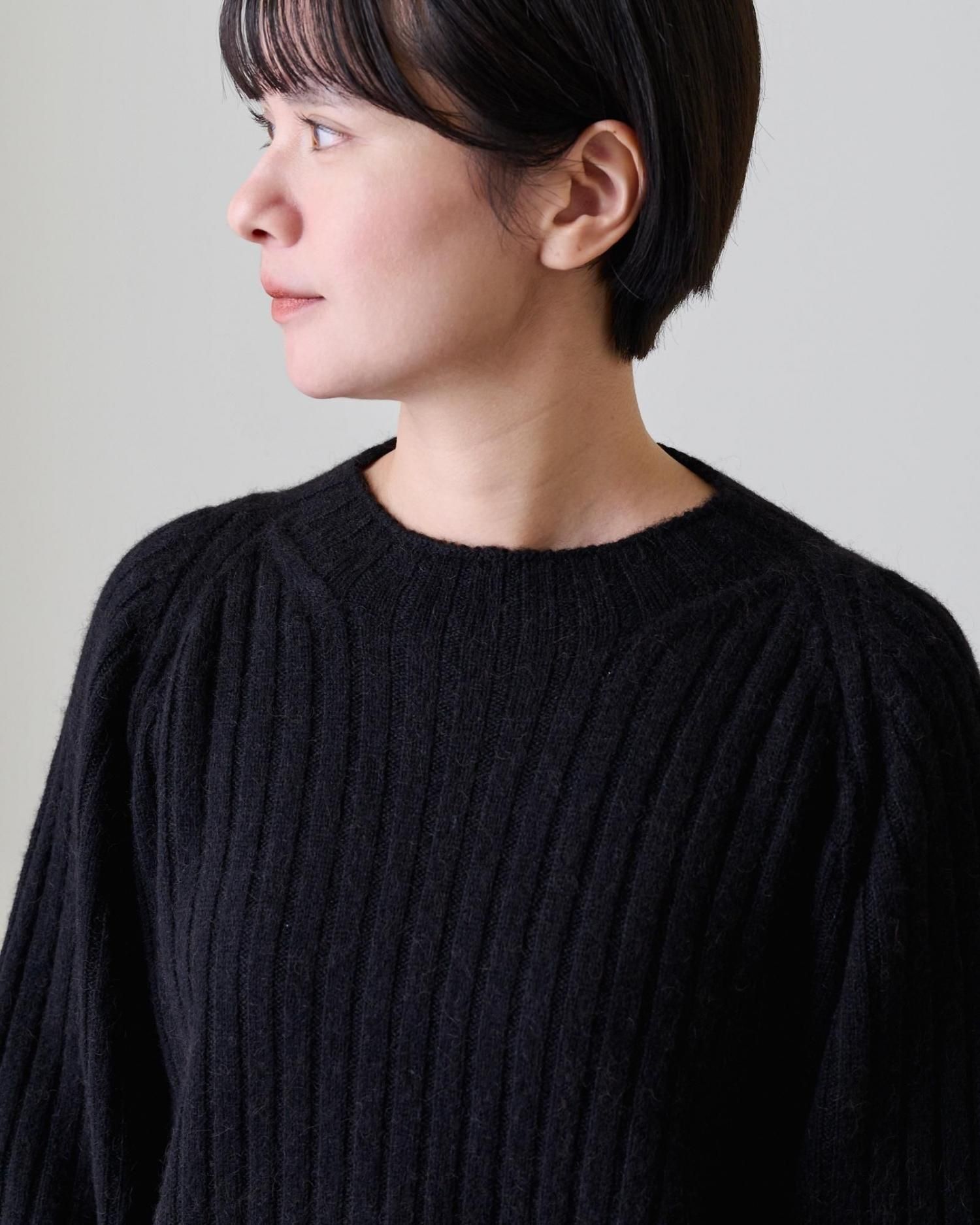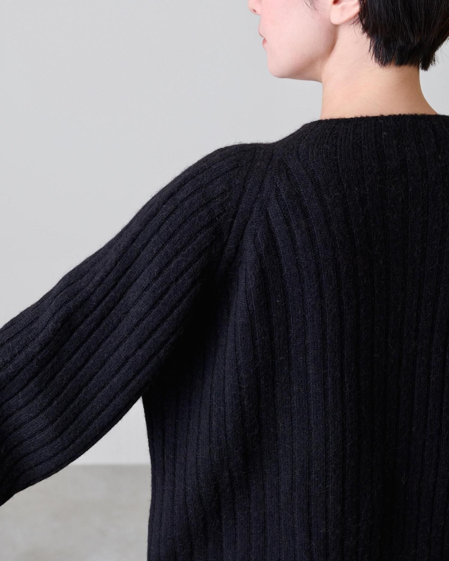 リブ編みで縦のラインを強調しつつ、袖付けはラグランスリーブにし、肩周りをコンパクトに見せるという考え抜かれたデザインです。