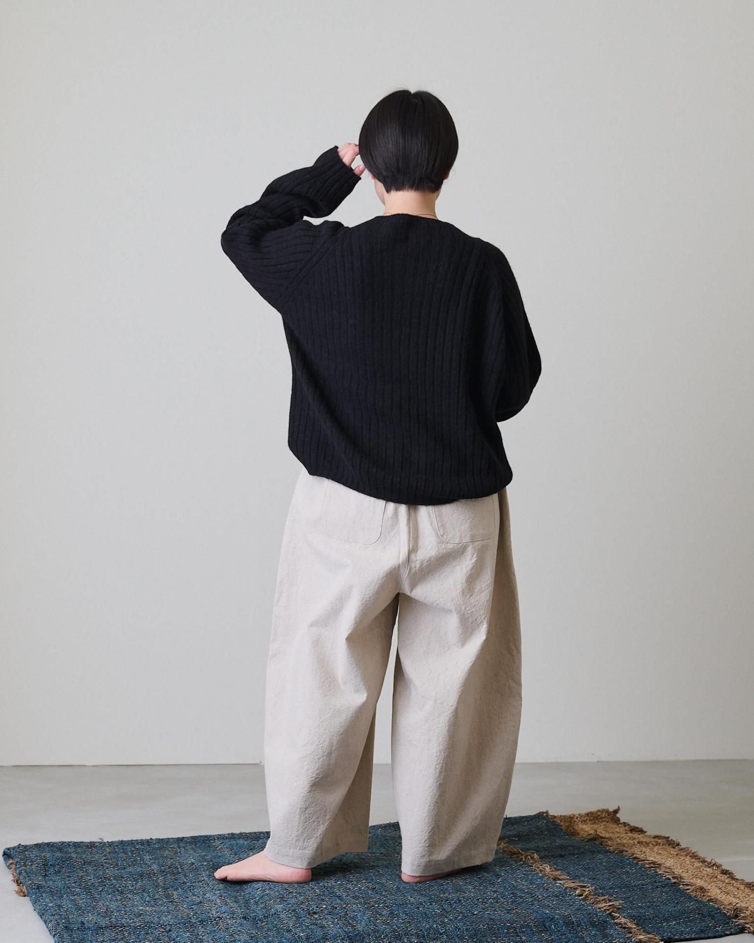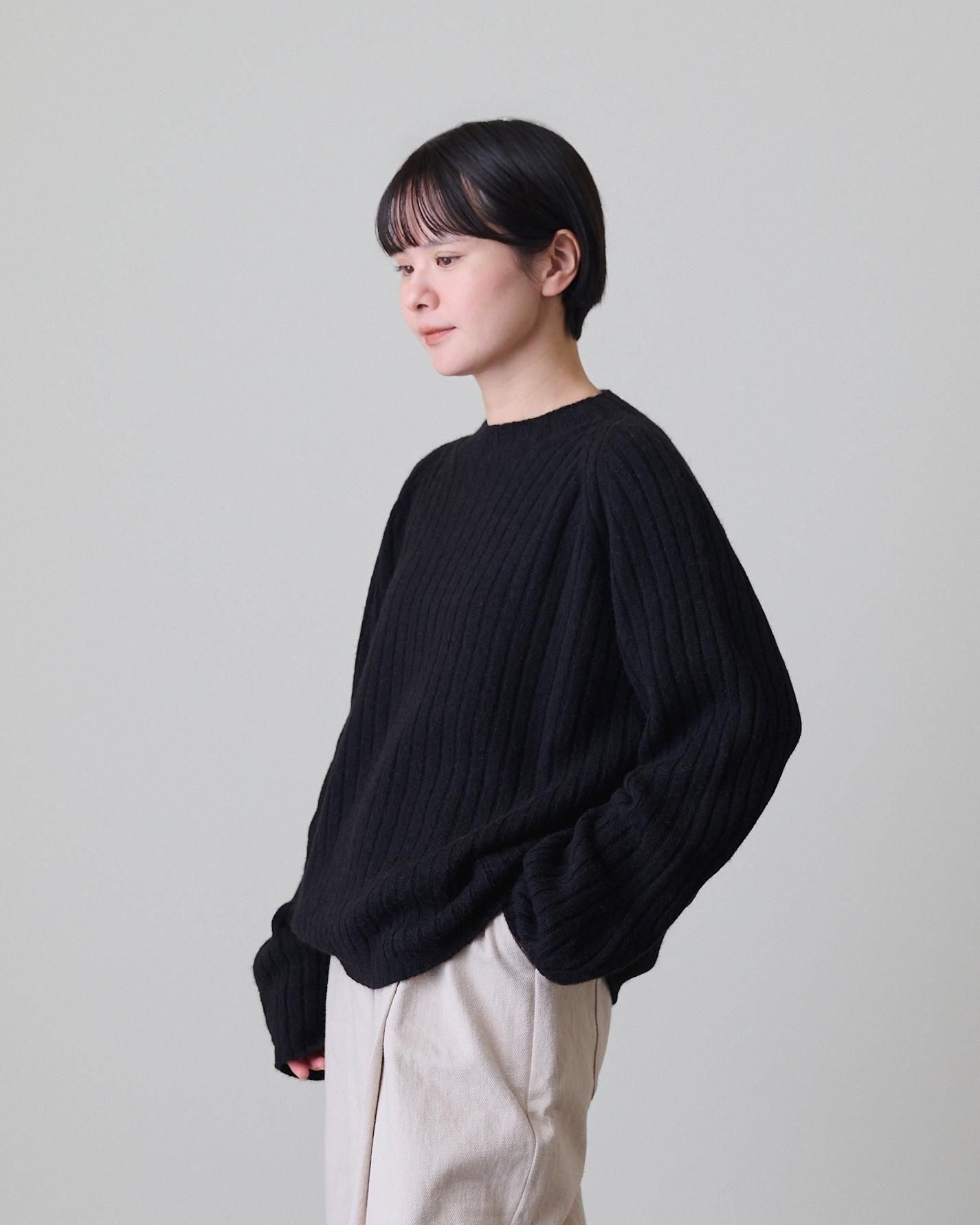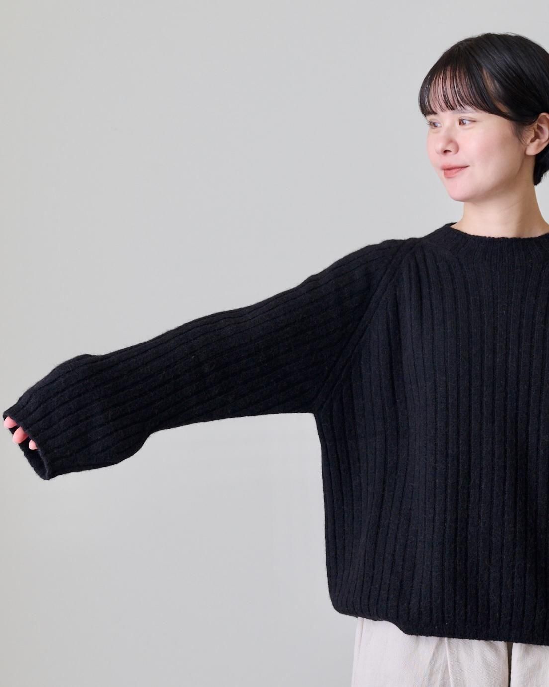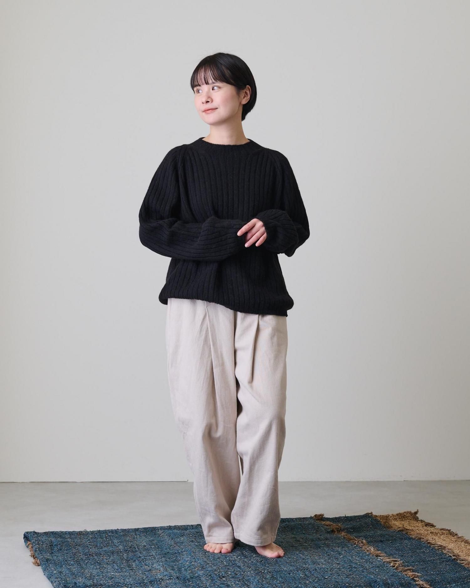 リブ編みで縦のラインを強調しつつ、袖付けはラグランスリーブにし、肩周りをコンパクトに見せるという考え抜かれたデザインです。