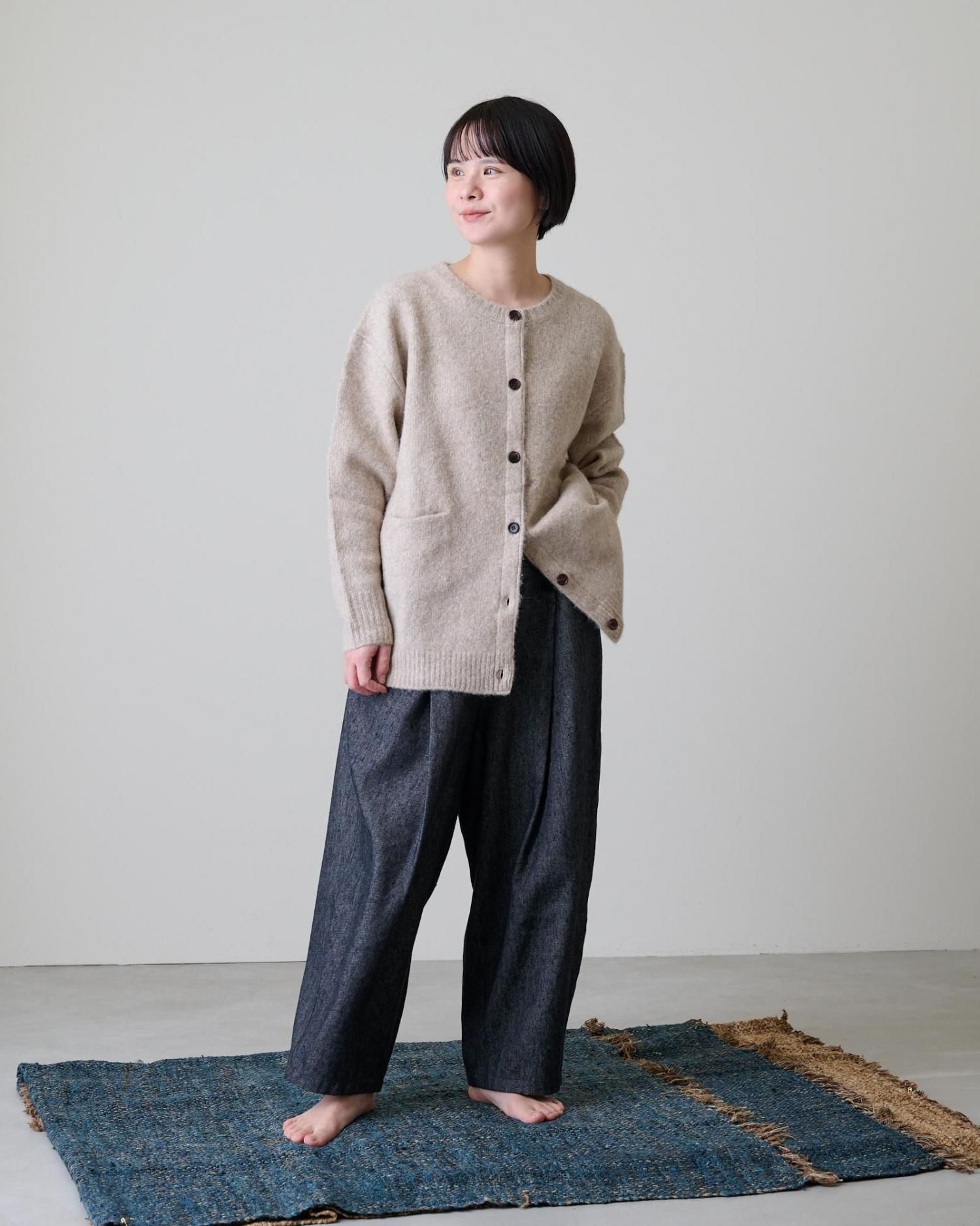 前の合わせ部分の裏側には補助布が当てられており、ニットの伸びやヨレを防ぎ、型崩れせずに長く着られるよう作られています。