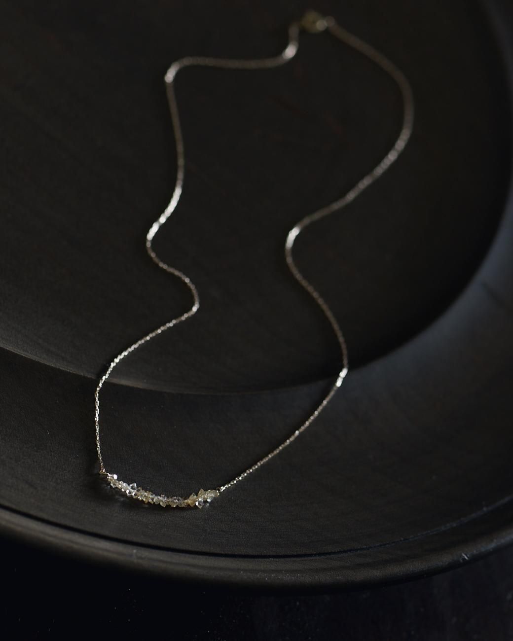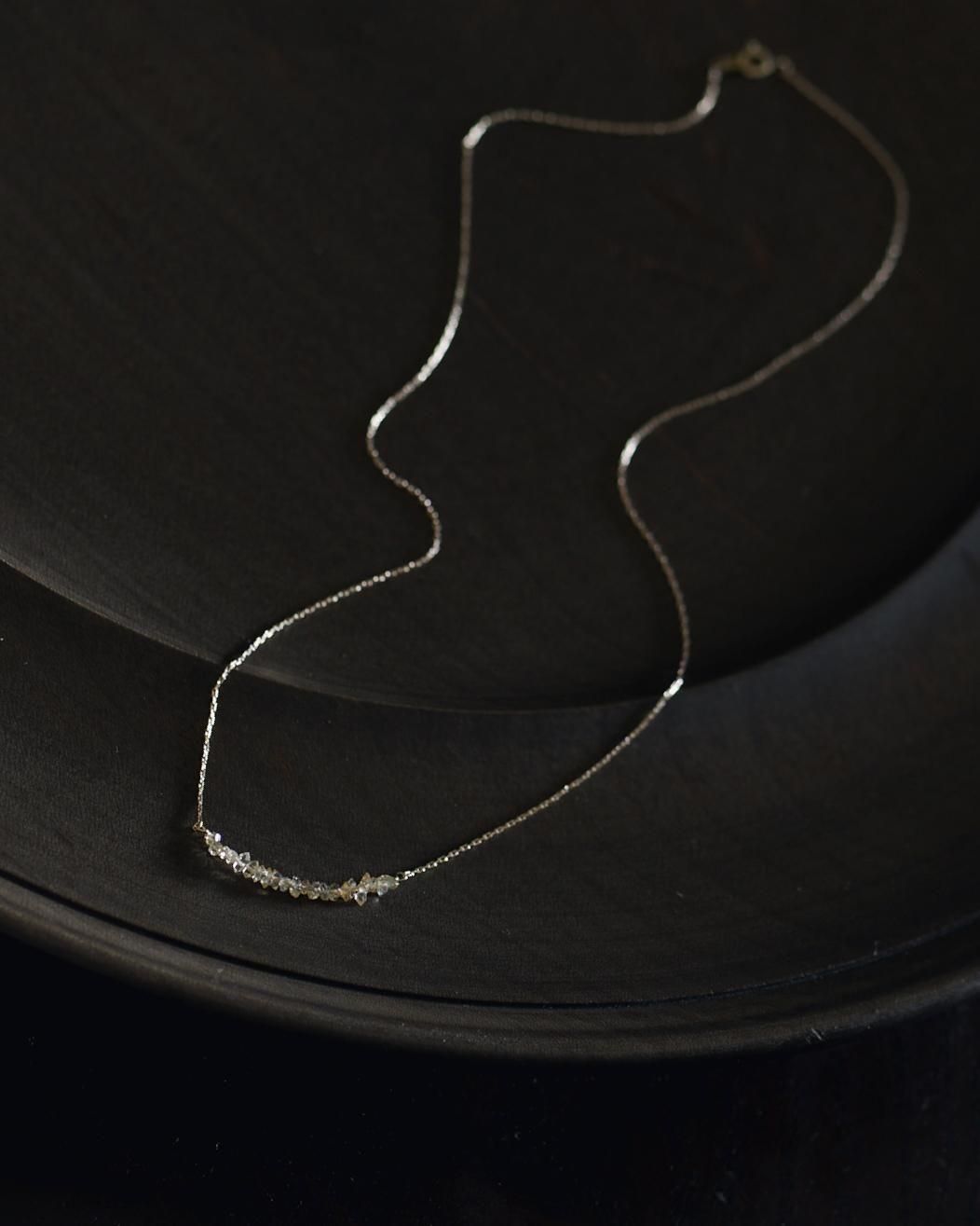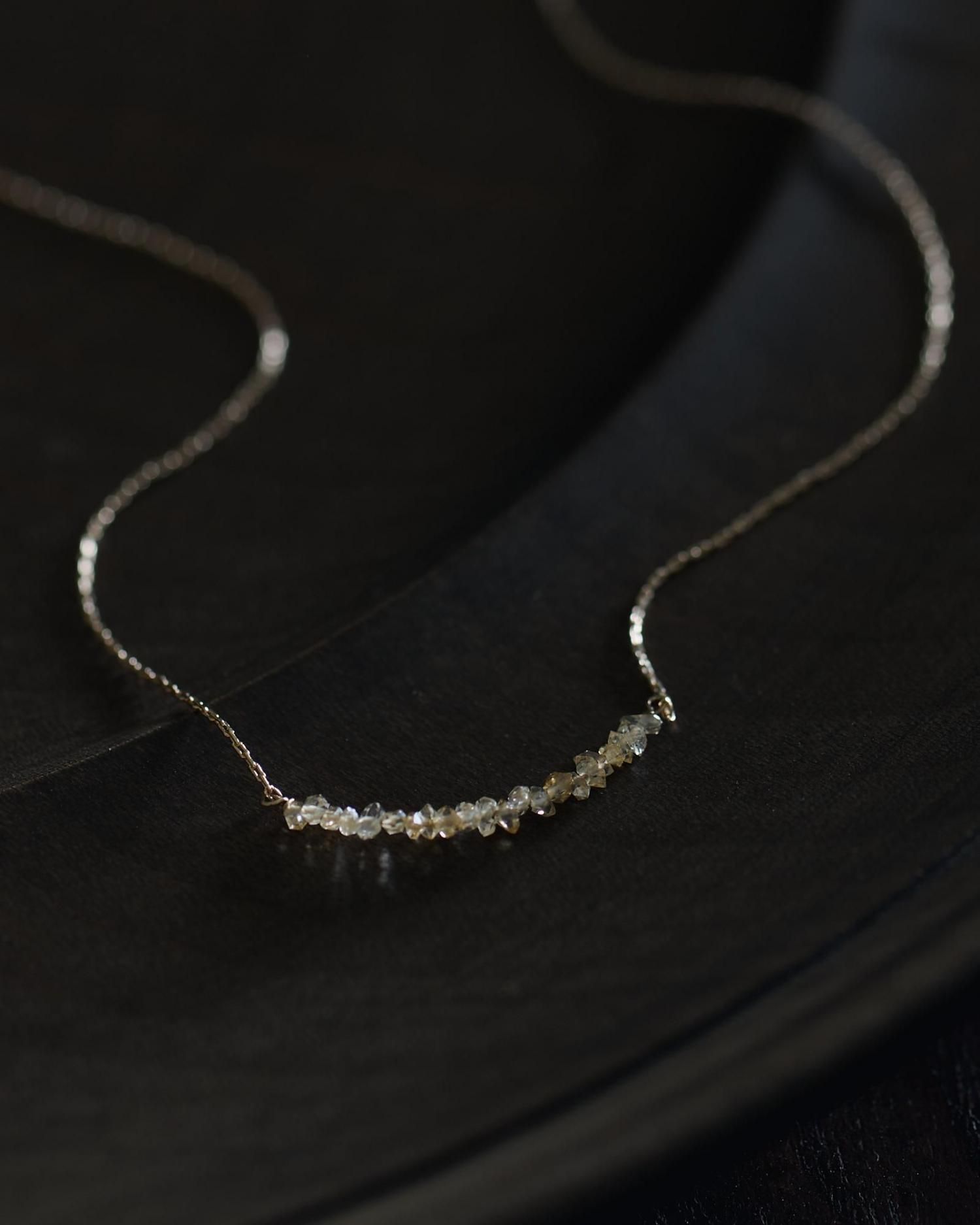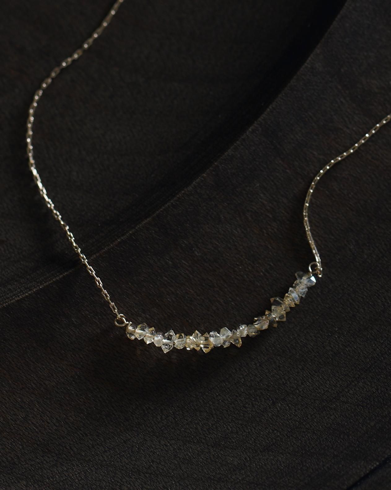 小粒のハーキマーダイヤモンドを連ねたネックレスには、控えめながらもパッと目をひく華やかさがあります。