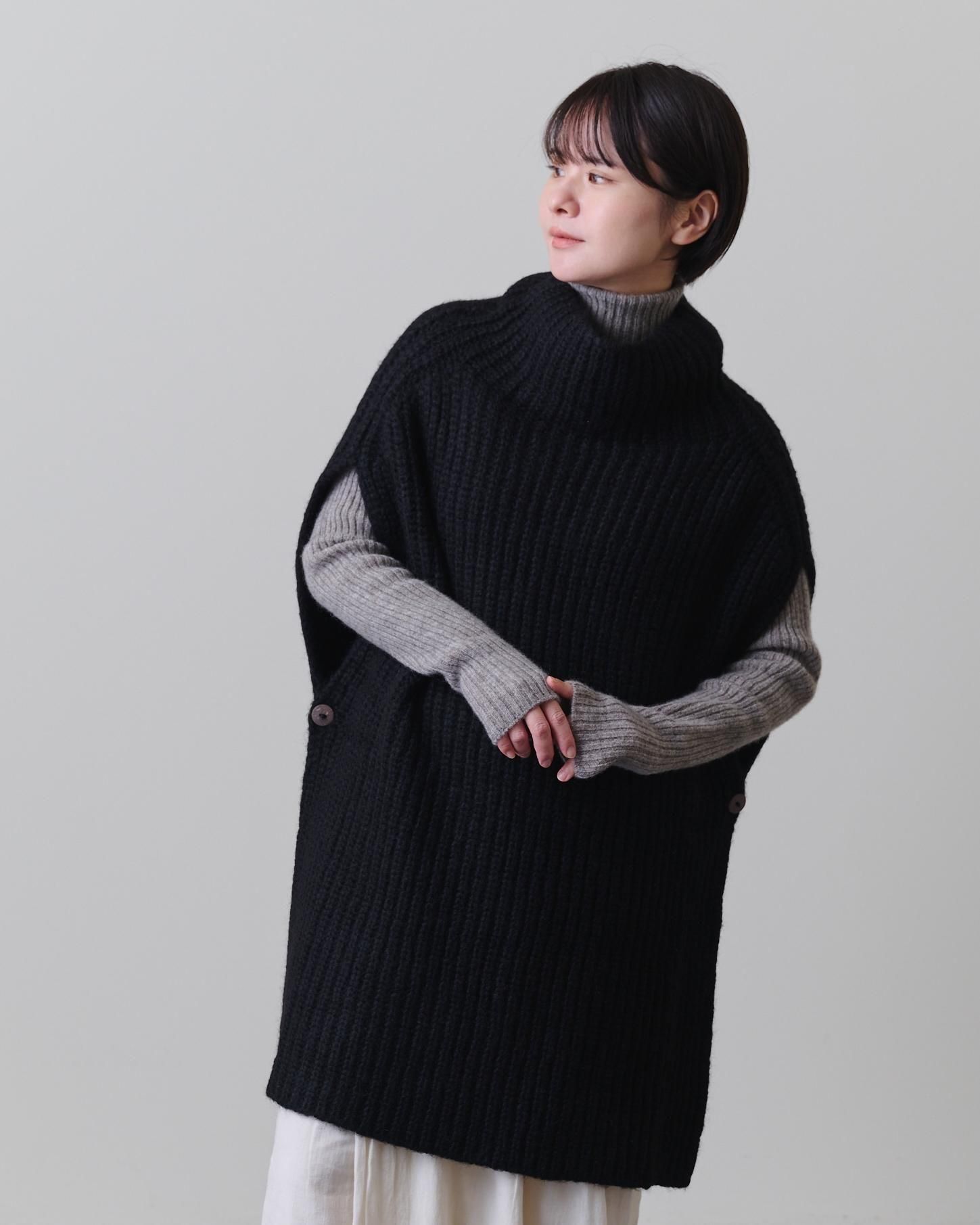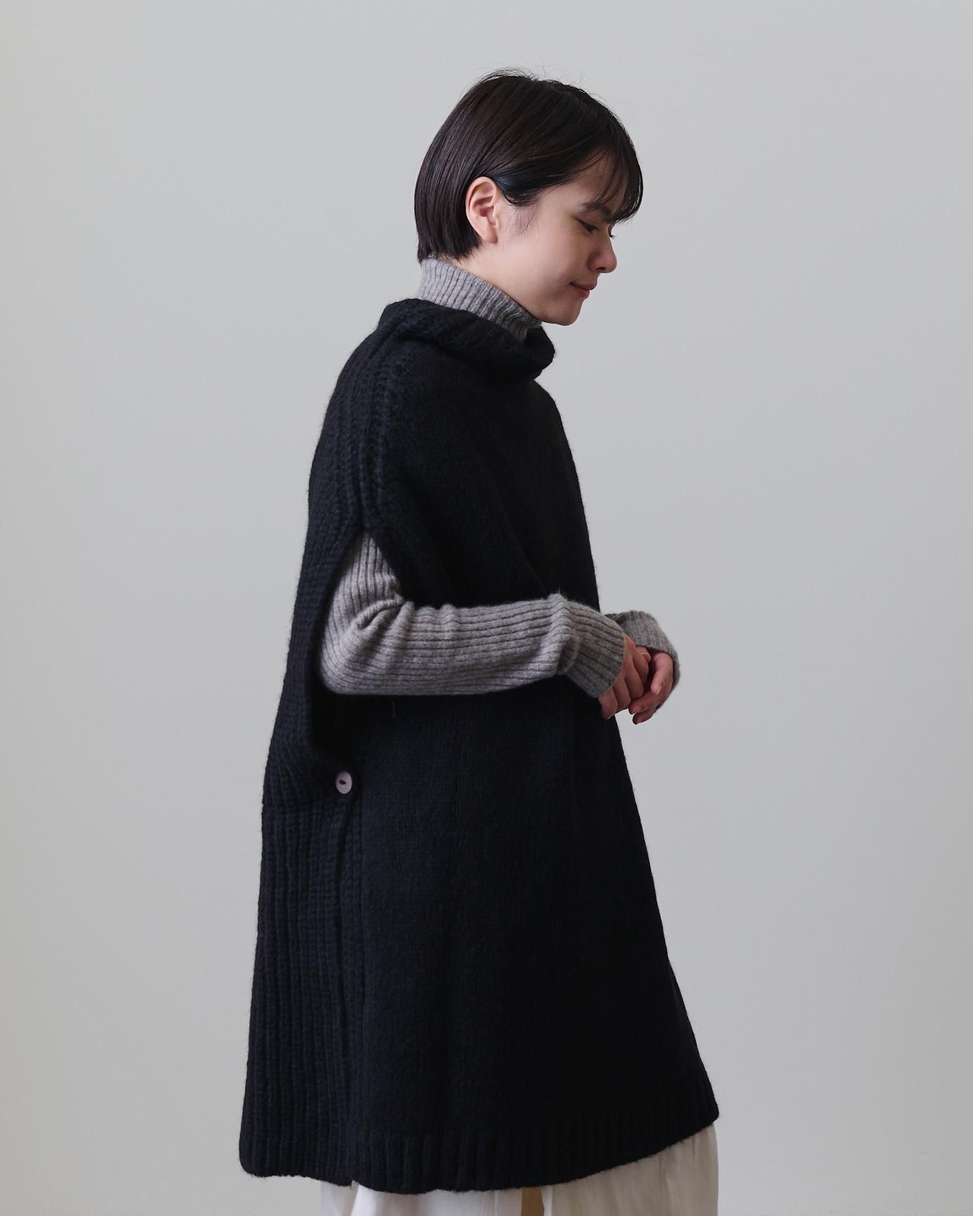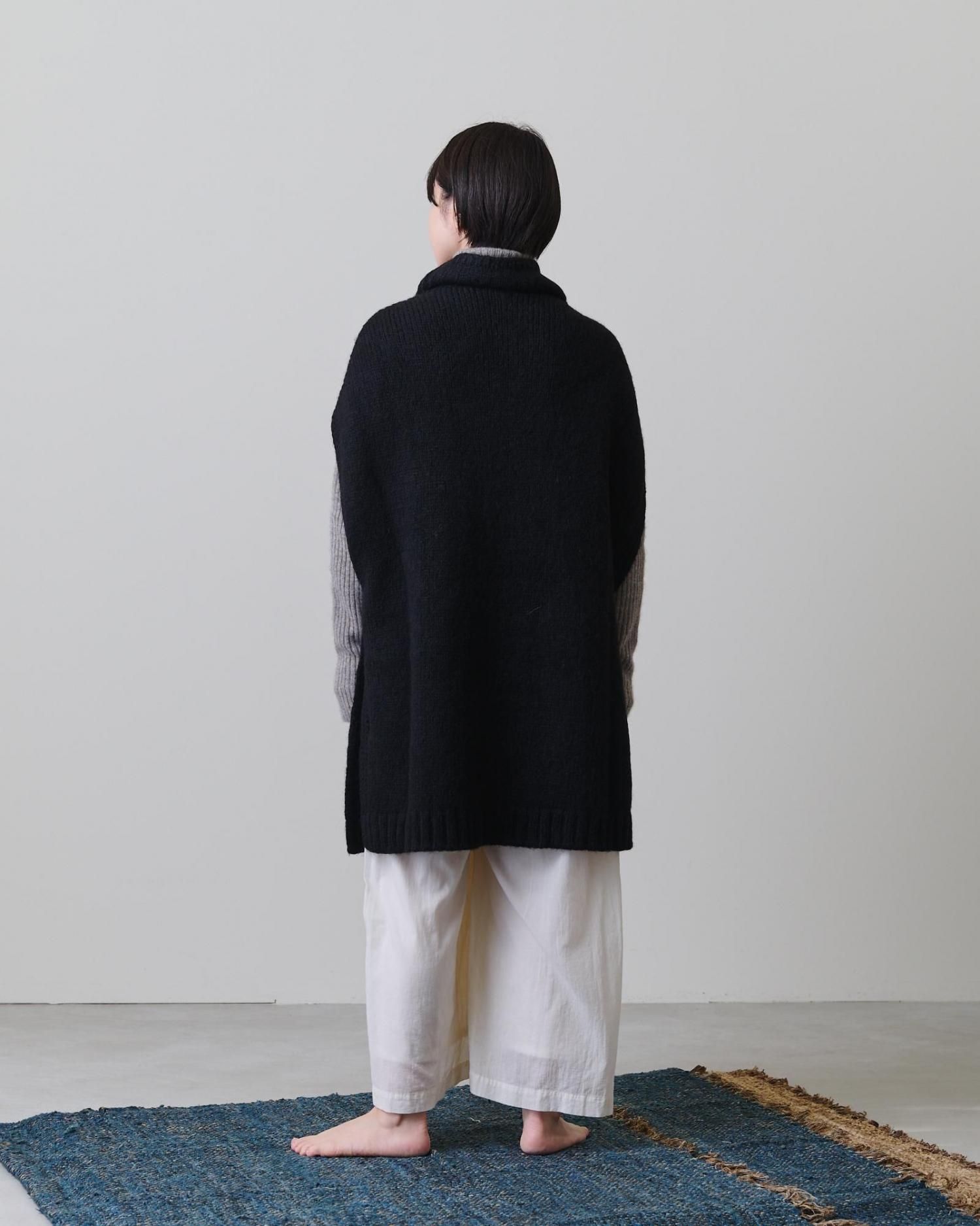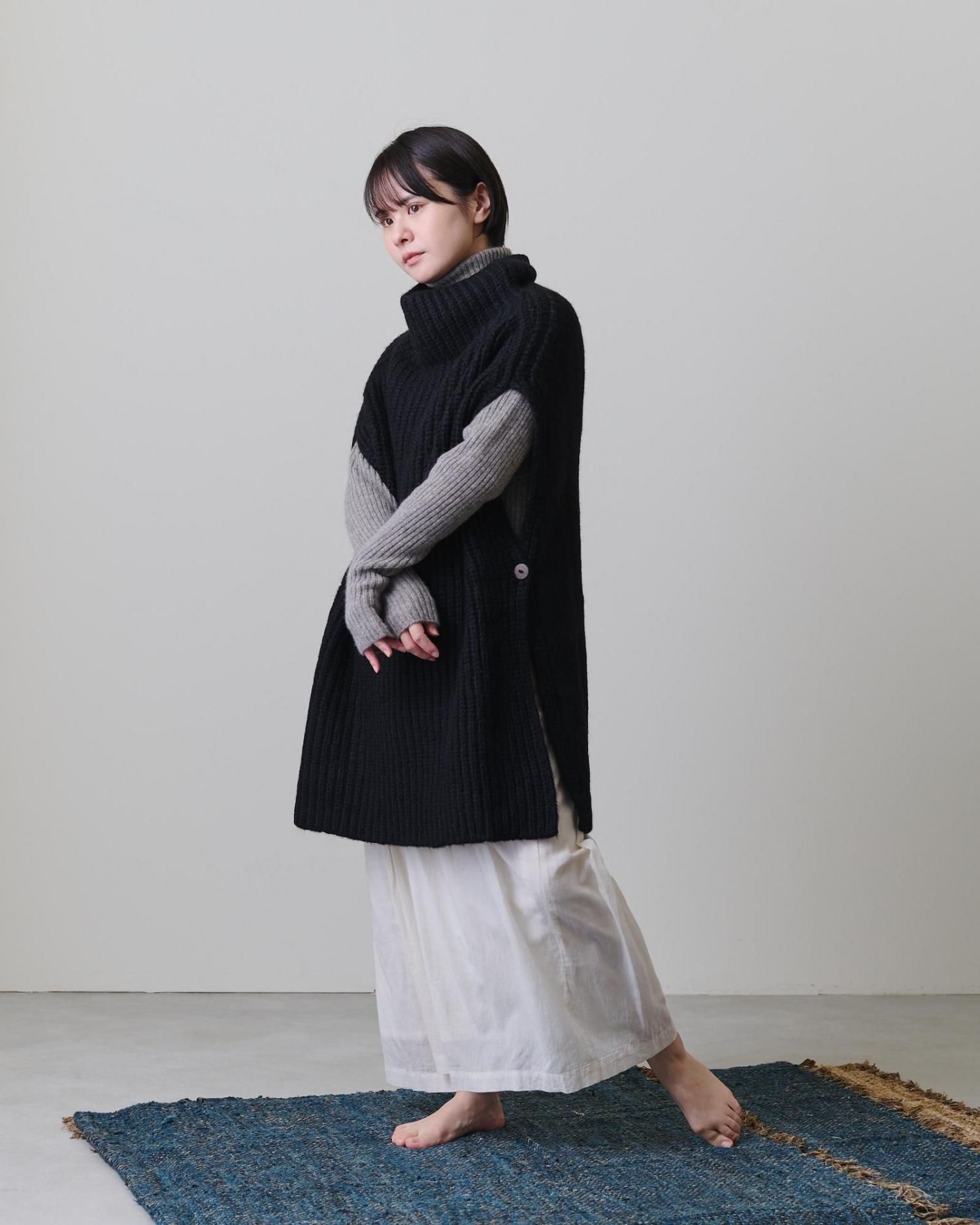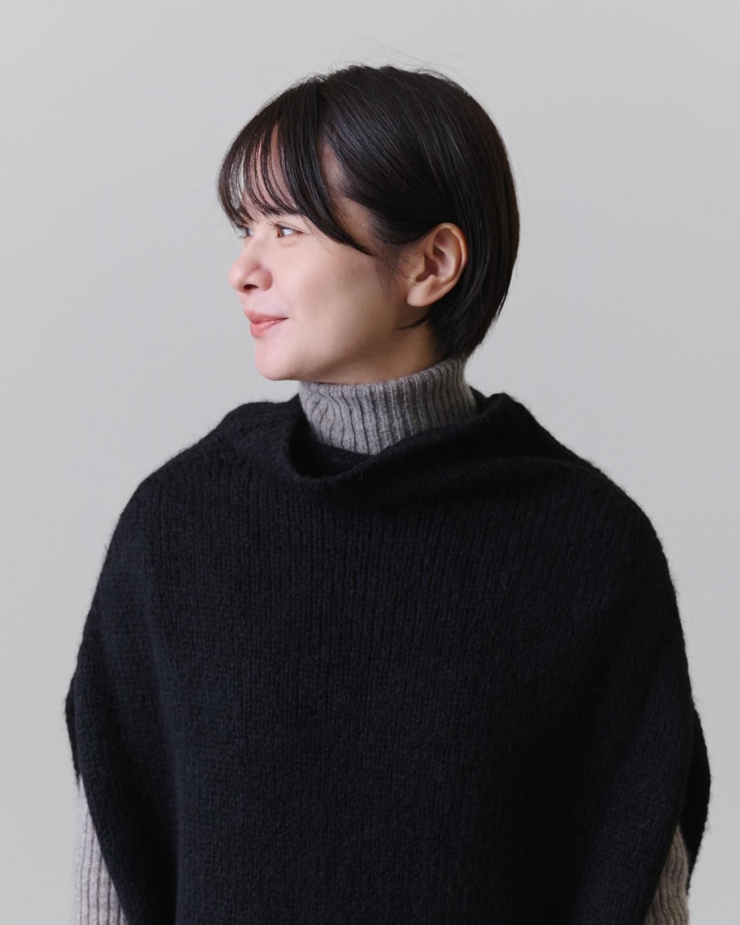 前後で編み方を変えたニットベストは、どちらを前にして着るかによって2wayの着こなしが楽しめるのが魅力です。