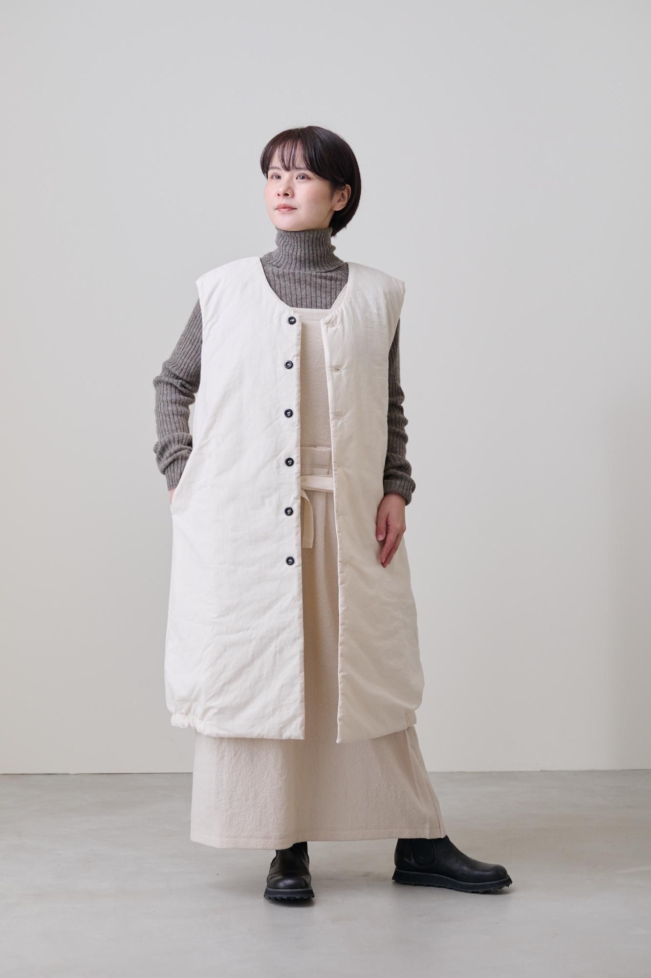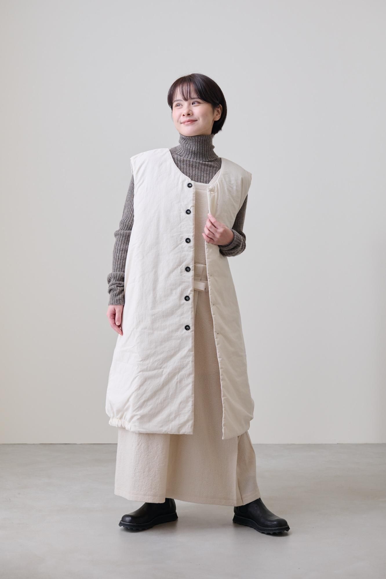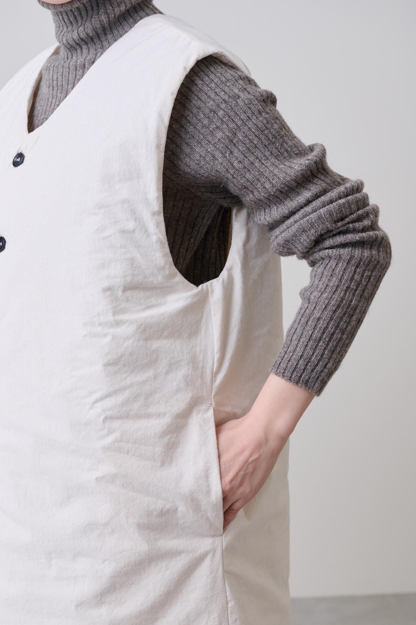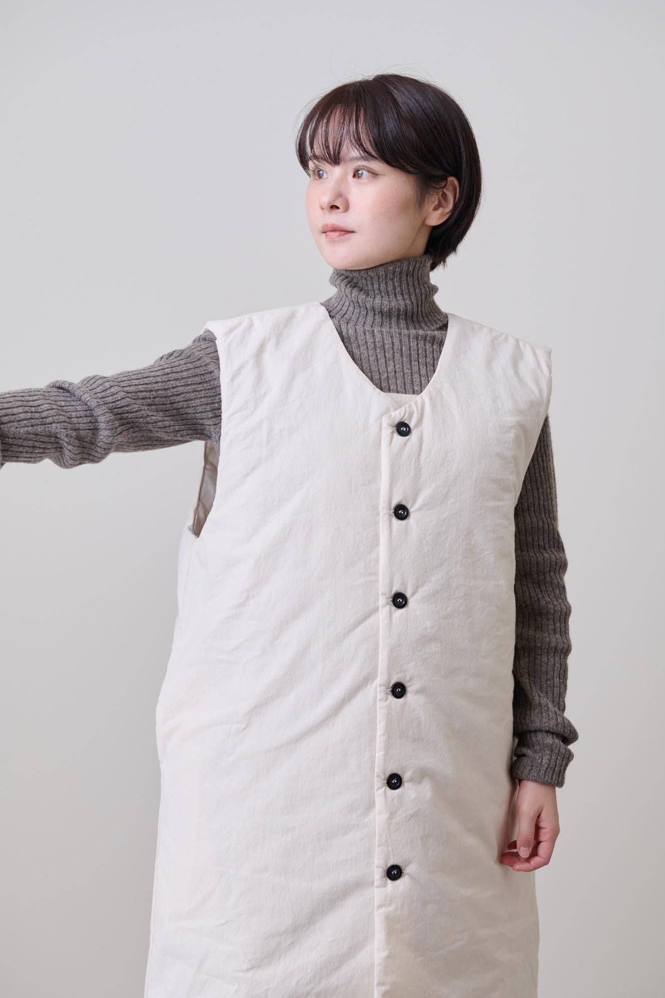 表にはナチュラルな風合いが魅力のコットンキャンバス生地を、裏地には艶感のあるキルティングを合わせ、表裏どちらでも着られる2wayのロングベストです。