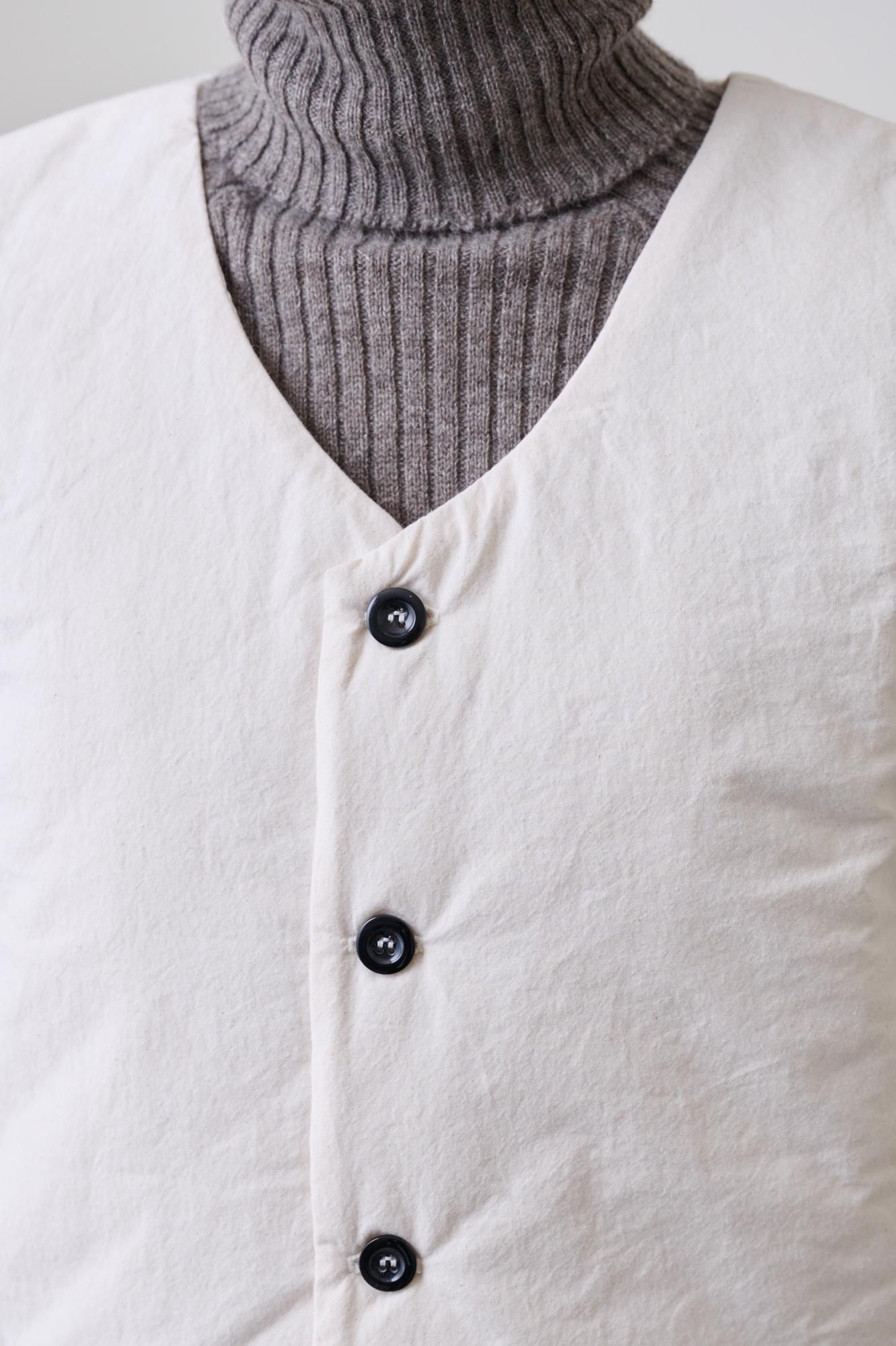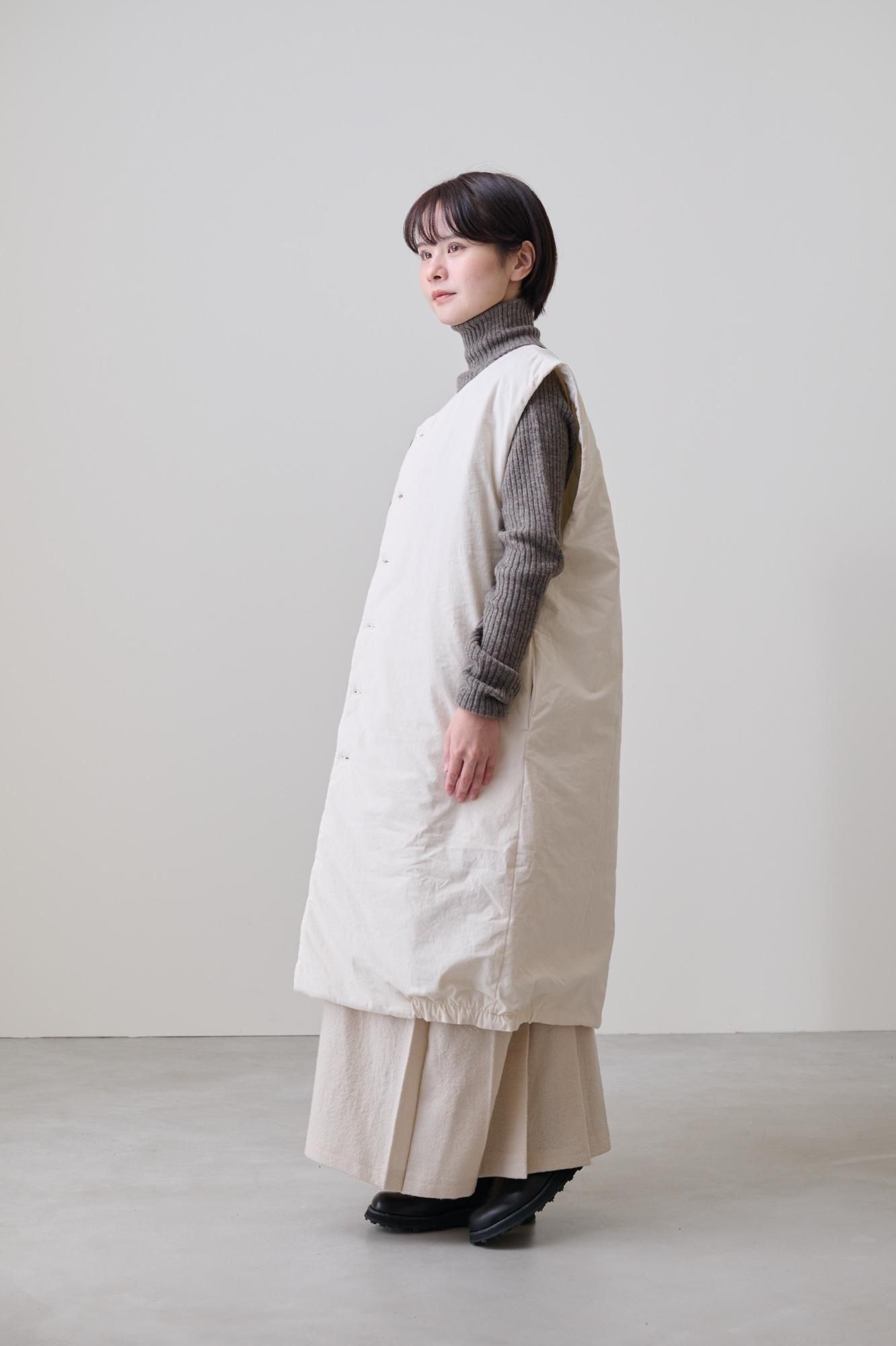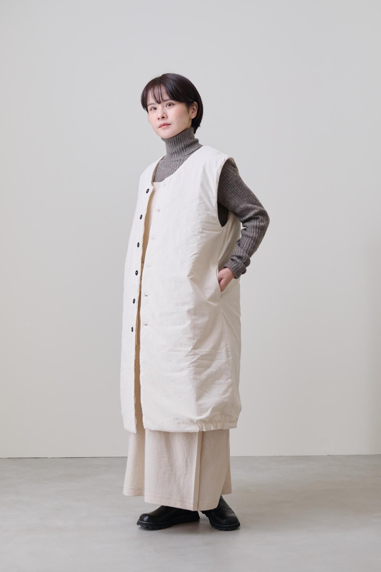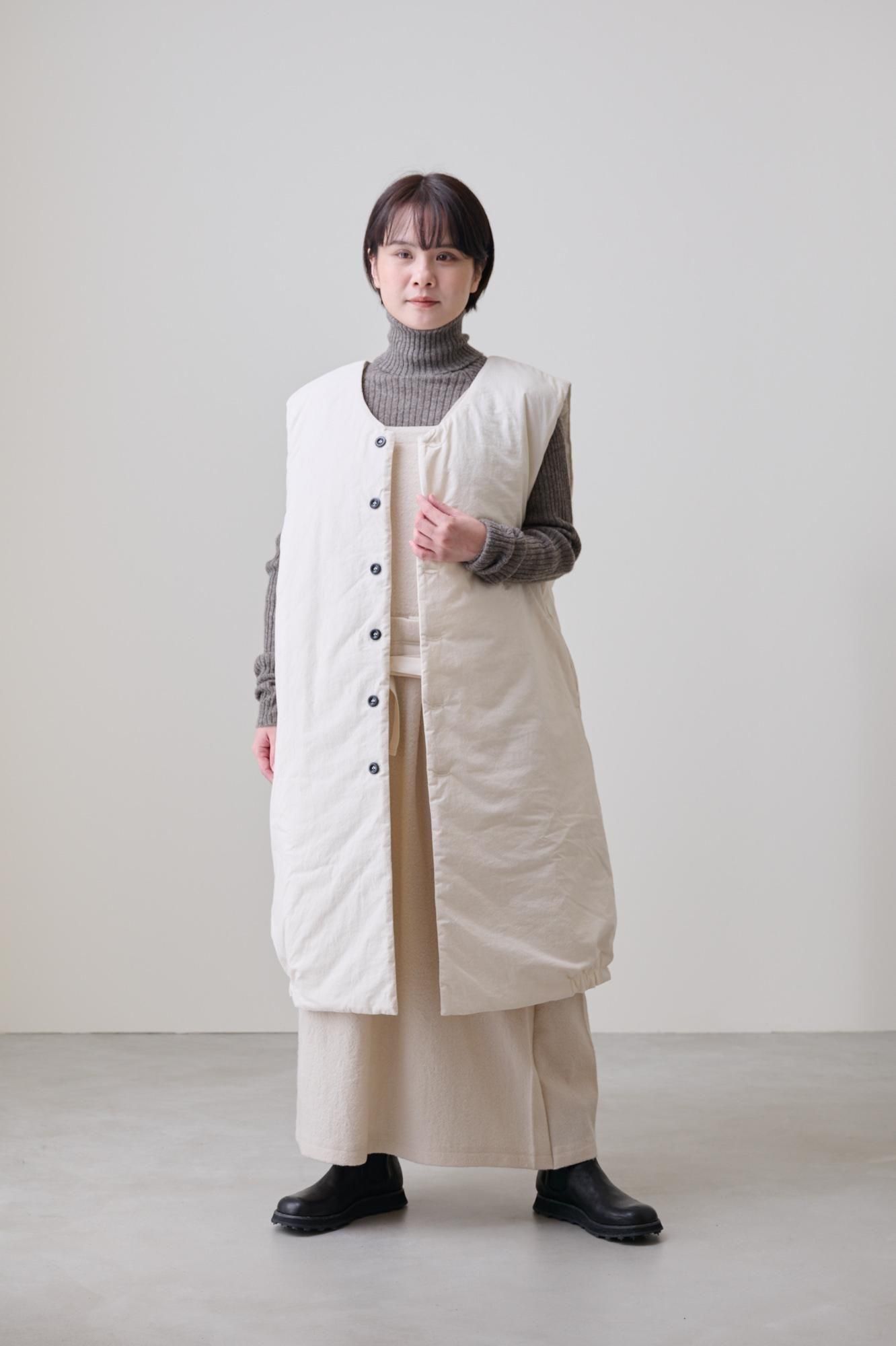 表にはナチュラルな風合いが魅力のコットンキャンバス生地を、裏地には艶感のあるキルティングを合わせ、表裏どちらでも着られる2wayのロングベストです。