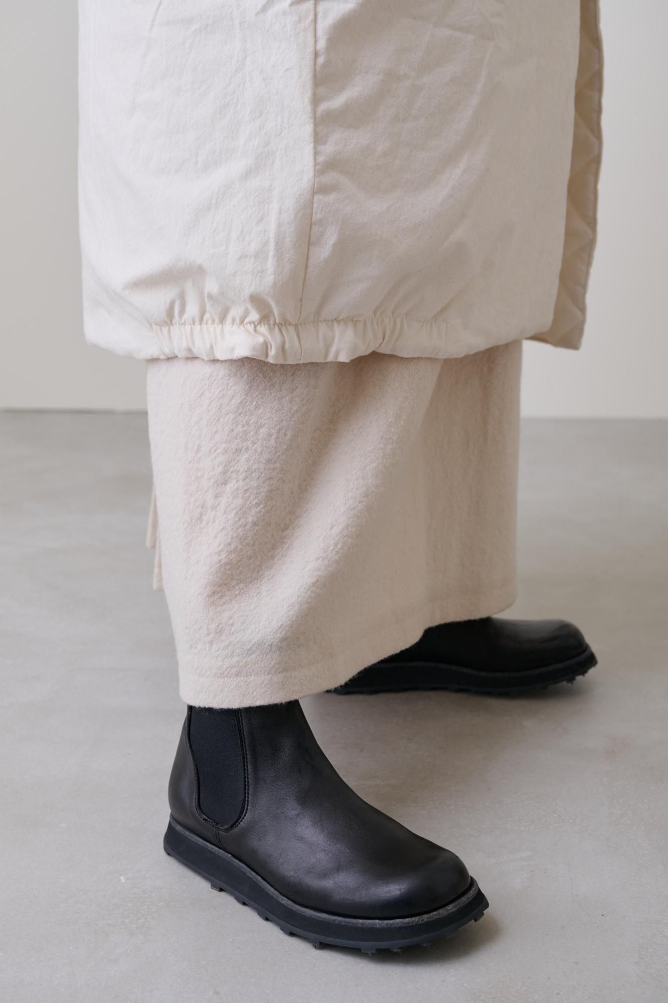両側の裾をゴムで絞ることにより、着太りして見えないバルーンシルエットに仕上げています。