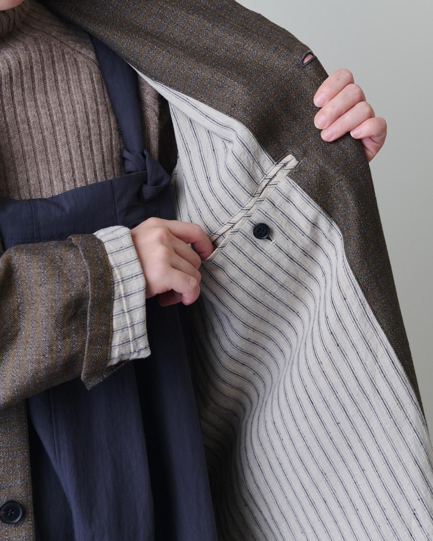 ブラウンにネイビーを配した生地は、表に顔を見せた白の縦糸がまるでステッチにようで、特別な雰囲気を演出しています。